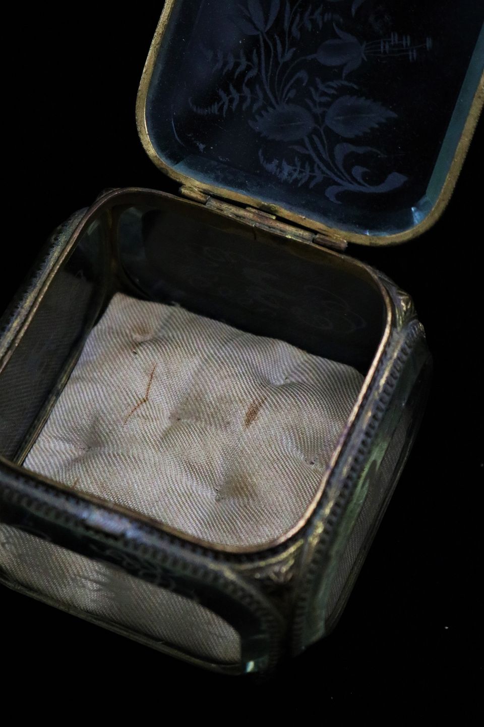Gammelt fransk smykkeskrin i bronze og facetslebne glas med slebne blomstermotiver i selve glasset , silkepude i bunden og med en fin gammel patina.