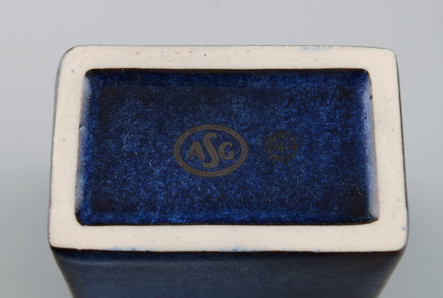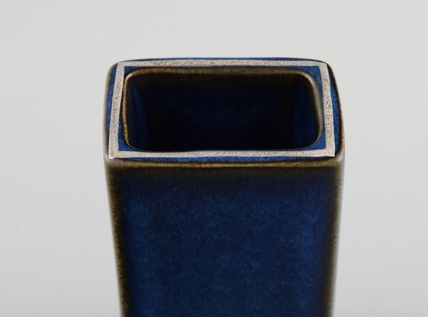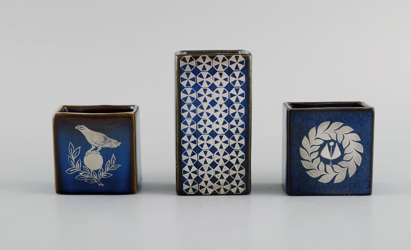 Sven Jonson (1919-1989) Gustavsberg. Fem små Lagun vaser i glaseret stentøj med sølvindlæg. Smuk glasur i blå nuancer. 1970'erne.