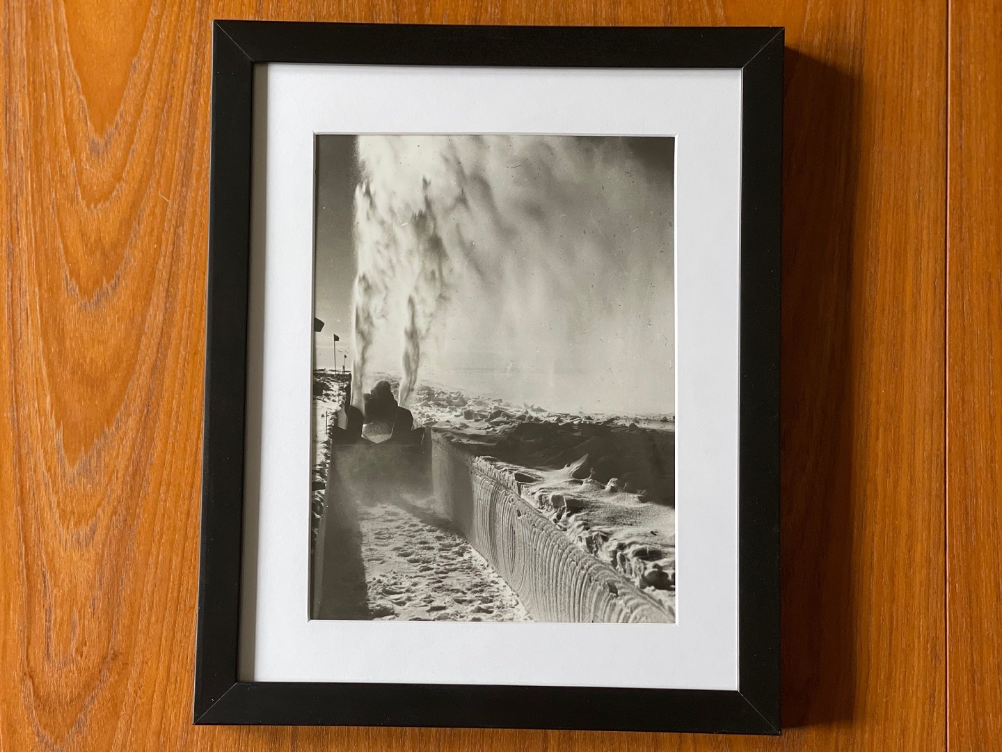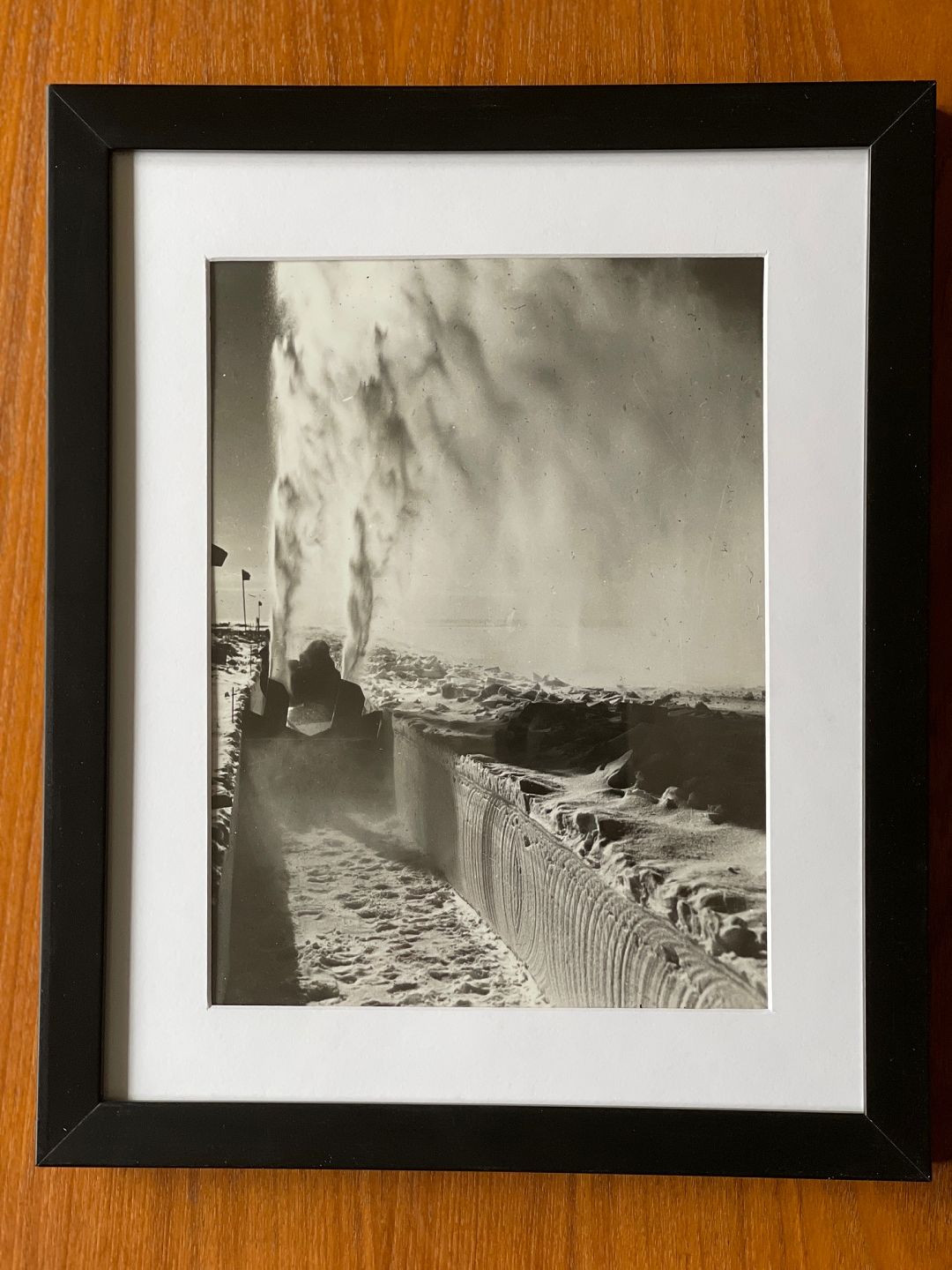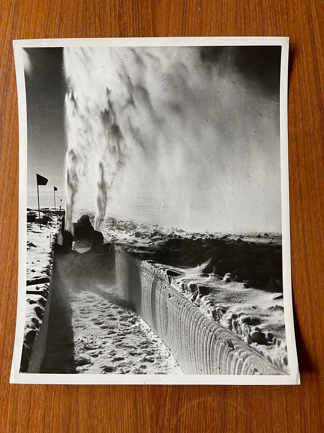 Originalt sort-hvidt vintage foto fra Grønland i 1955 af en såkaldt Peter Snow Miller maskine, som den amerikanske hær brugte til at grave dybe render i indlandsisen under den kolde krig.