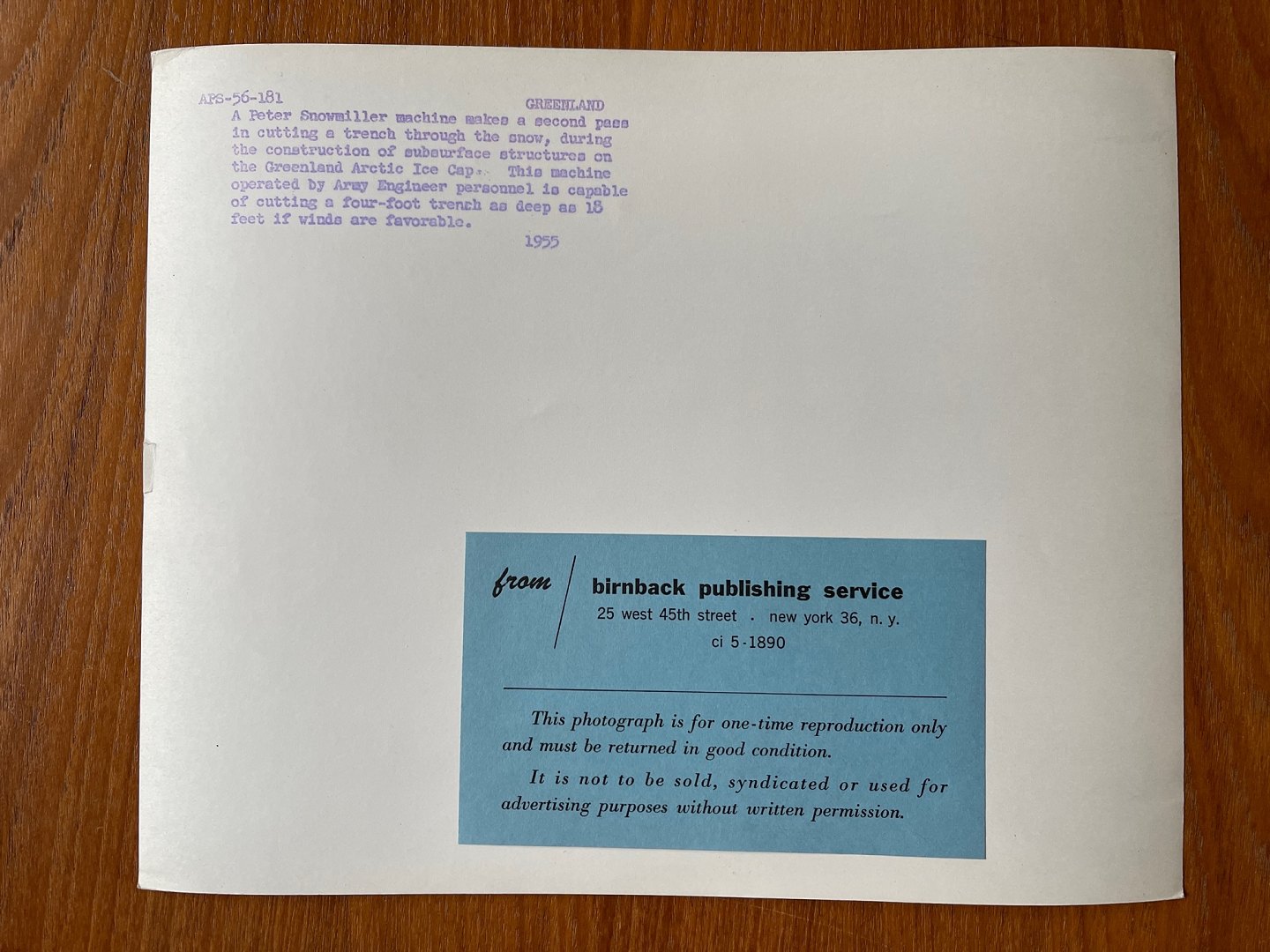 "A Peter Snowmiller machine makes a second pass in cutting a trench through the snow, during the construction of subsurface structures n the Greenland Arctic Ice Cap. This machine operated by Army Engineer personnel is capable of cutting a four-foot trench as deep as 18 feet if winds are favorable. 1955."