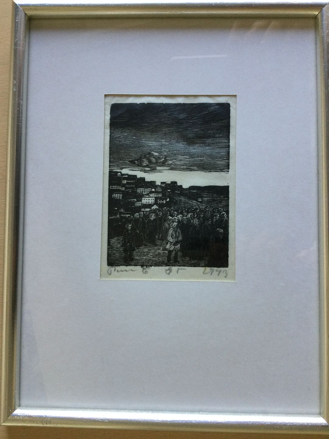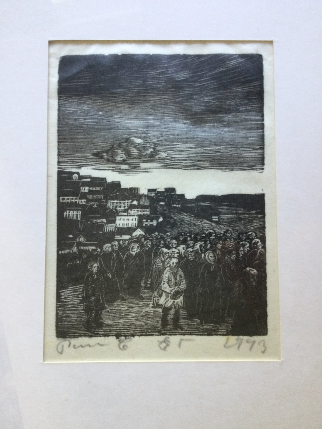 Træsnit af Povl Christensen 1943 - Forsamling i udkanten af en by.