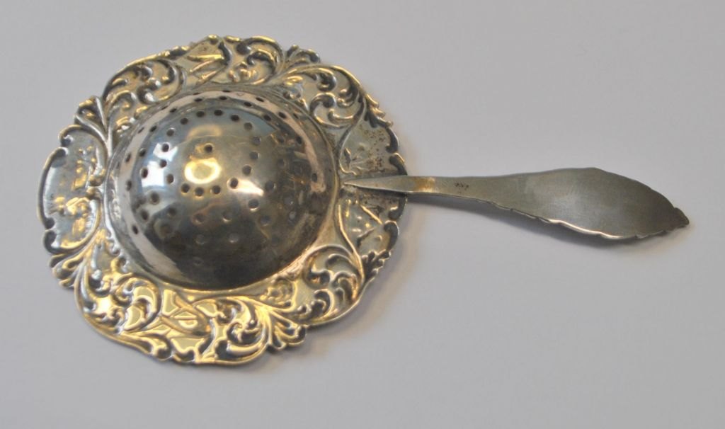 Engelsk the si i sterling sølv, 20. årh. Med rococo dekorationer med fugle og landskaber. L.: 12 cm. Vægt: 22 gram.