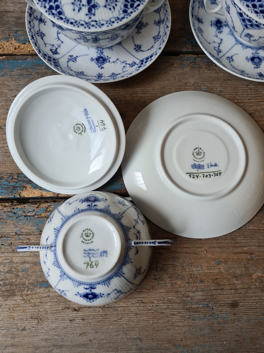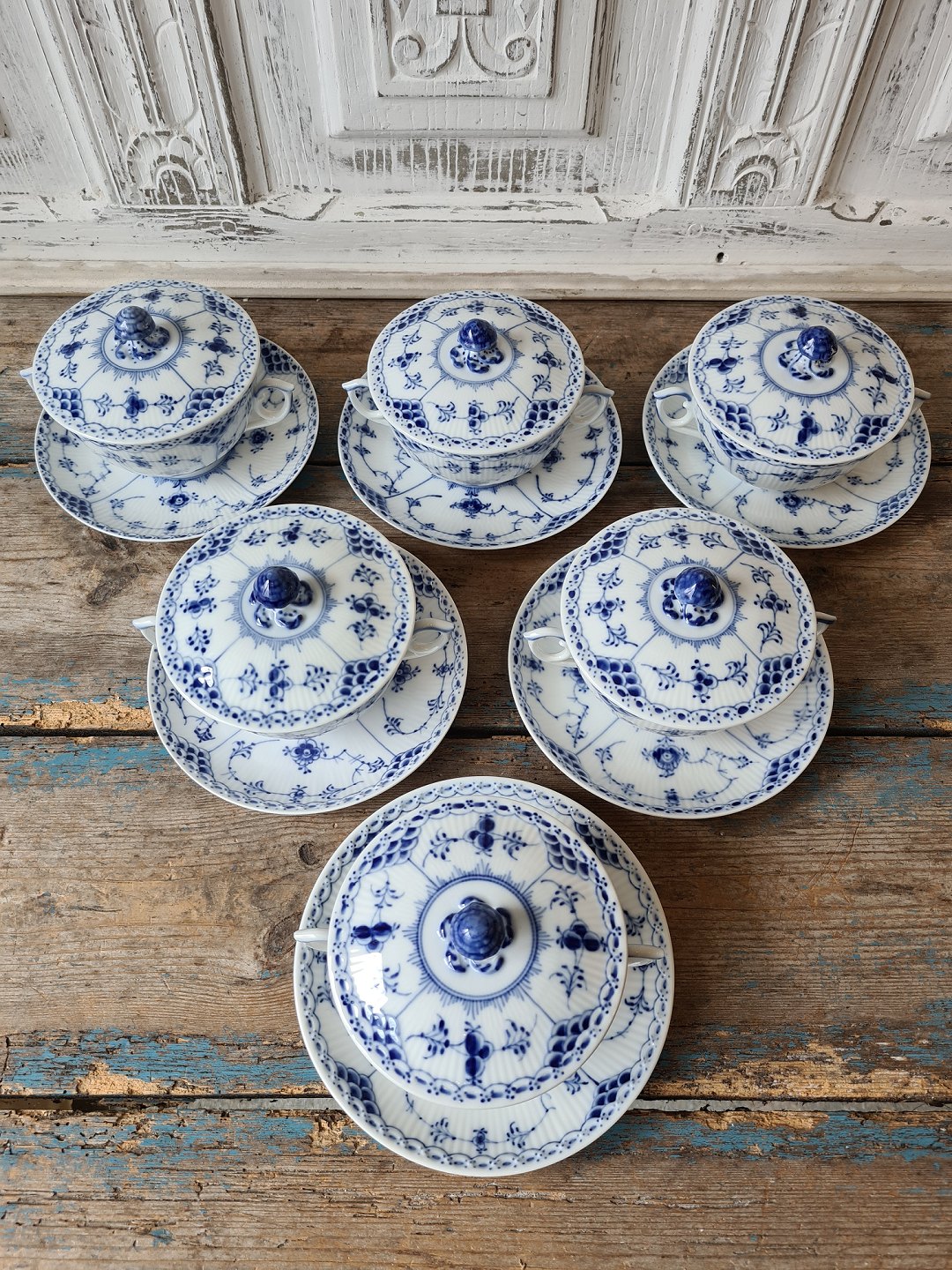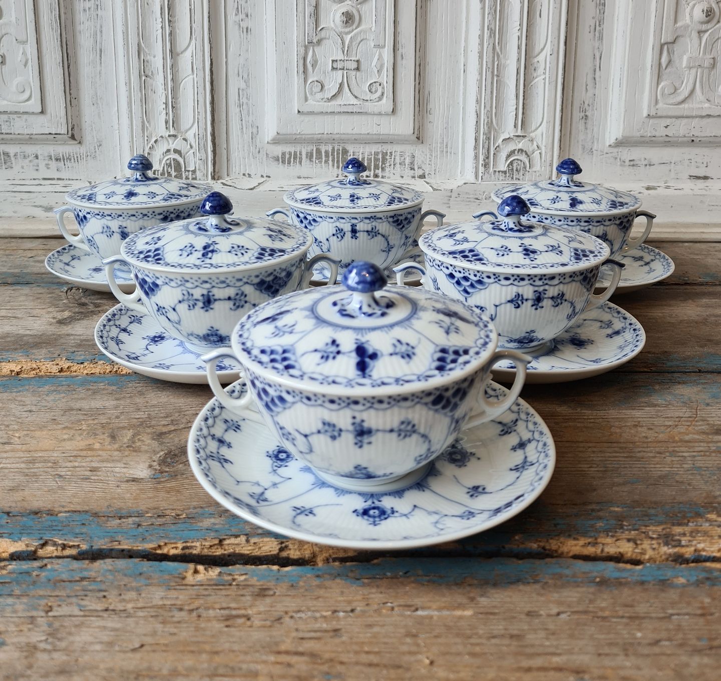 Text zugänglich auf Dänische: Royal Copenhagen Musselmalet halvblonde bouillonkop med låg og underkop