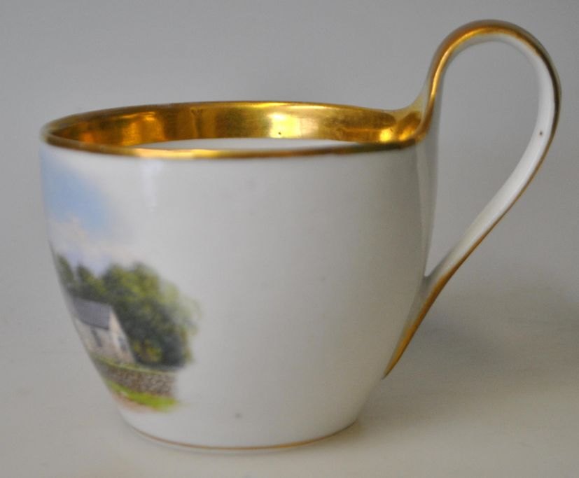 Royal Copenhagen kop, 19. årh. med topografisk motiv. København, Danmark. Hvidt porcelæn med guldkant. Håndmalet dekoration af landsby med kirke og gående. Vigerslev kirke på Fyn. Stemplet. H.: 9 cm.  Enestående dekorations arbejde. Sjældent arbejde. Perfekt stand! Der ydes ingen rabatpå dette lot!