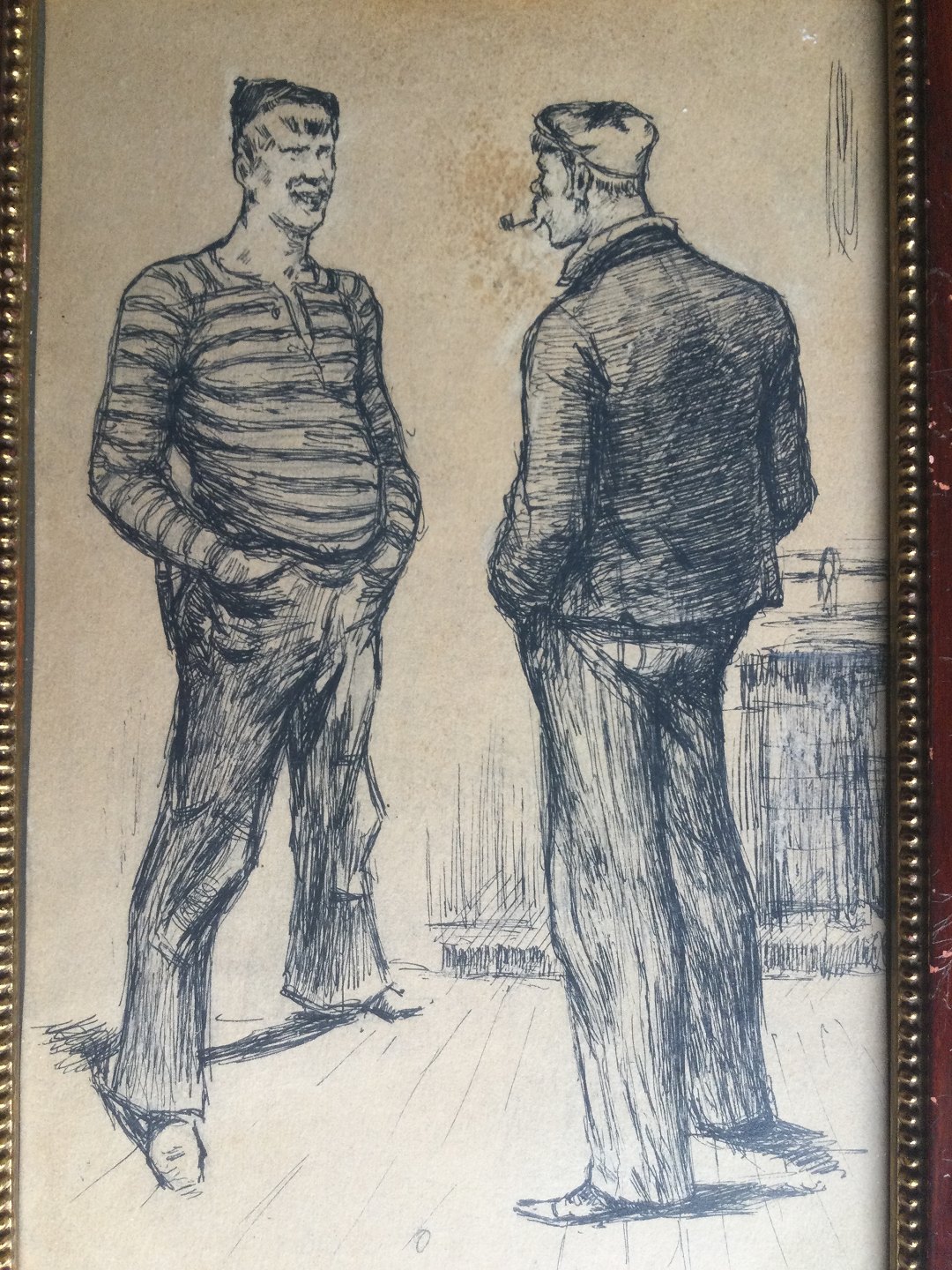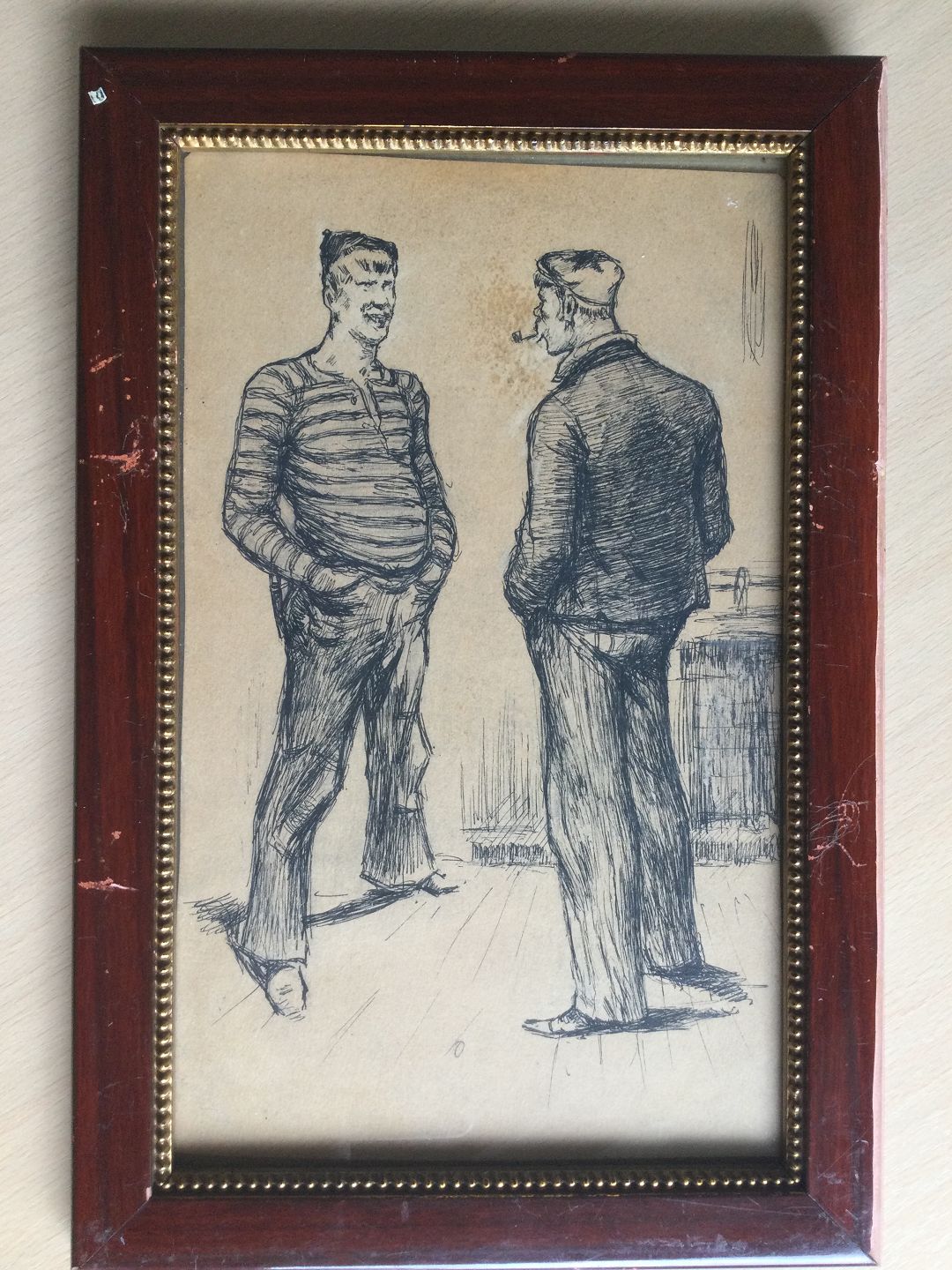 Tegning af Eigil Petersen - 2 sømænd i samtale.