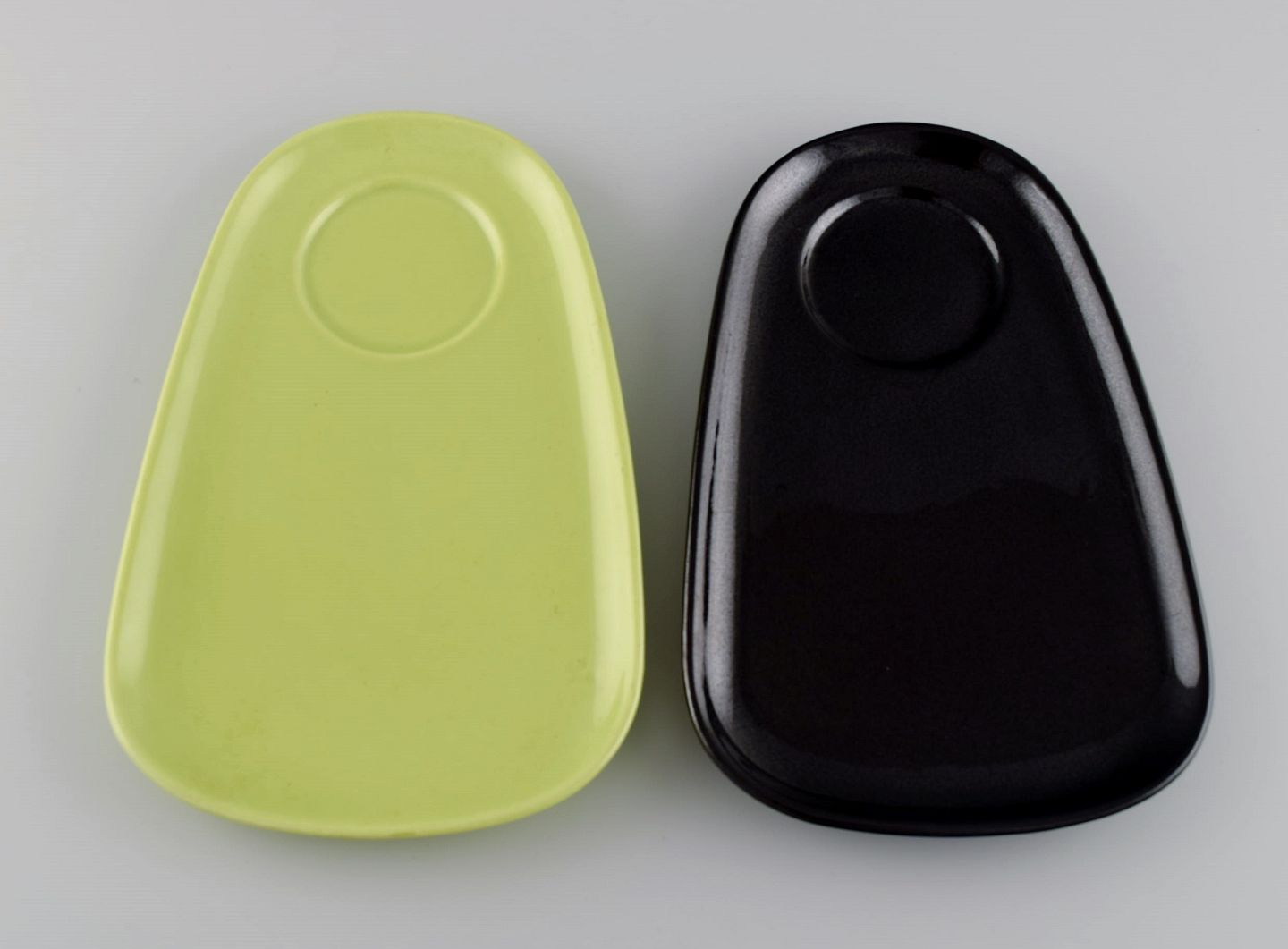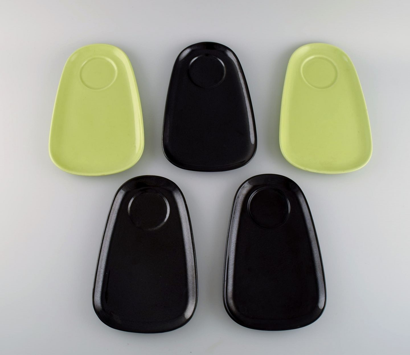 Stig Lindberg for Gustavsberg. Fem sættebakker til kopper / krus i glaseret porcelæn. Svensk design, 1960'erne.