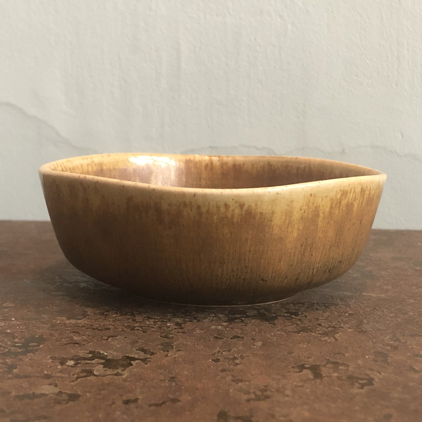 Skål af stentøj med changerende brune nuancer glasur (harepelsglasur).