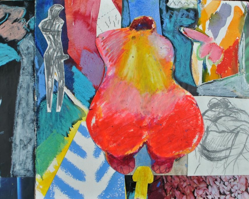 Noer, Lene (1951 - ) Danmark: Erotisk komposition. Blandform. Verso betegnet. 34 x 43 cm.