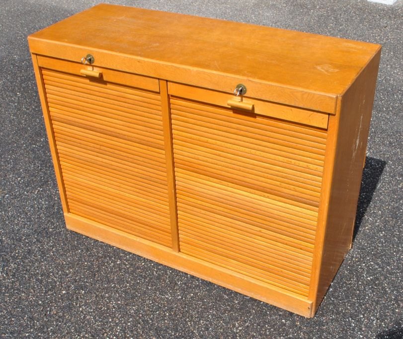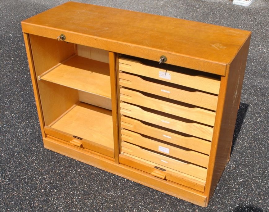 Dansk design jalousi skab i lyst egetræ, 20. årh. En del med hylder - den anden del med skuffer. H.: 75 cm. L.: 99 cm.  D.: 30 cm. Med nøgler.