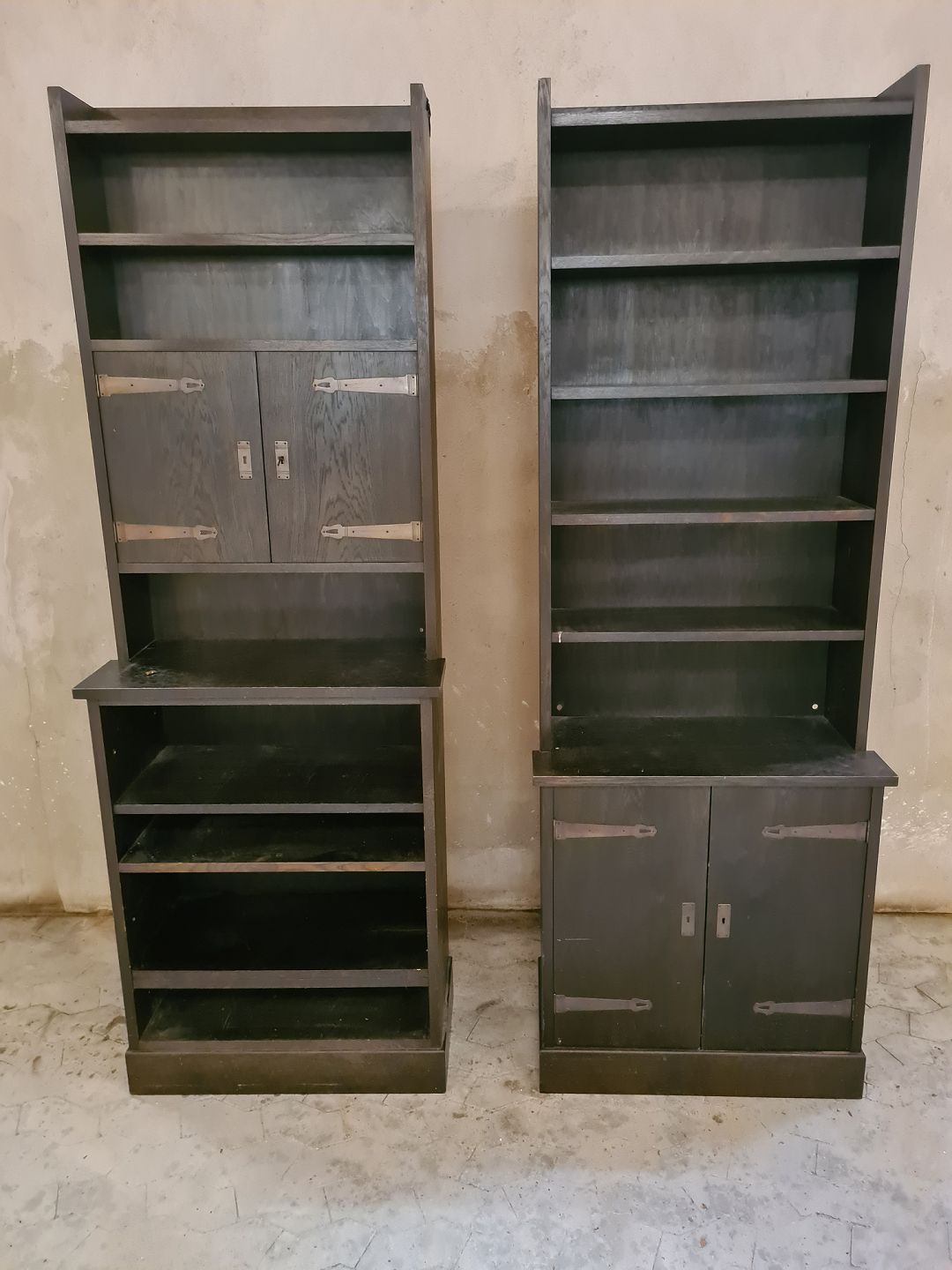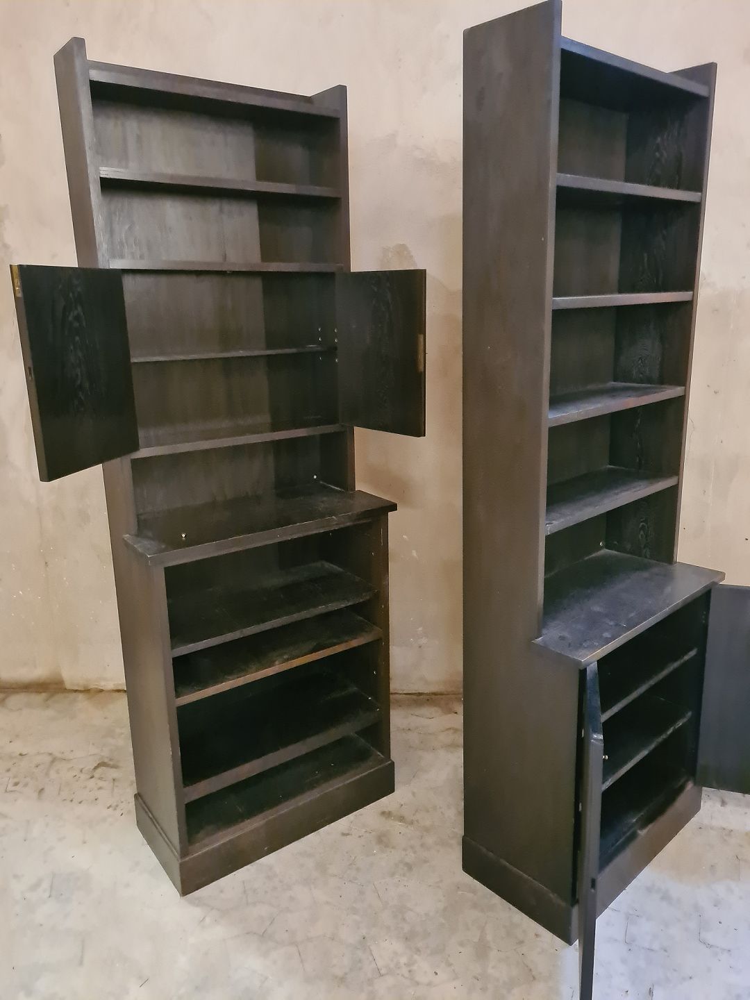 2 gode reoler i colonial stil fra 1920´erne. Fremstillet i bejdset fyr. Fremstår velholdte uden de store brugsspor.