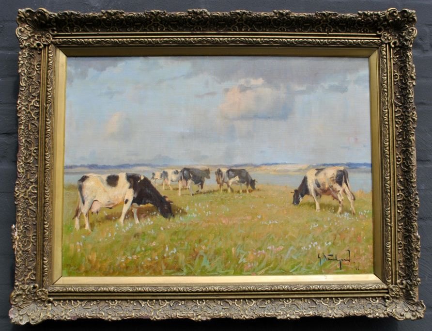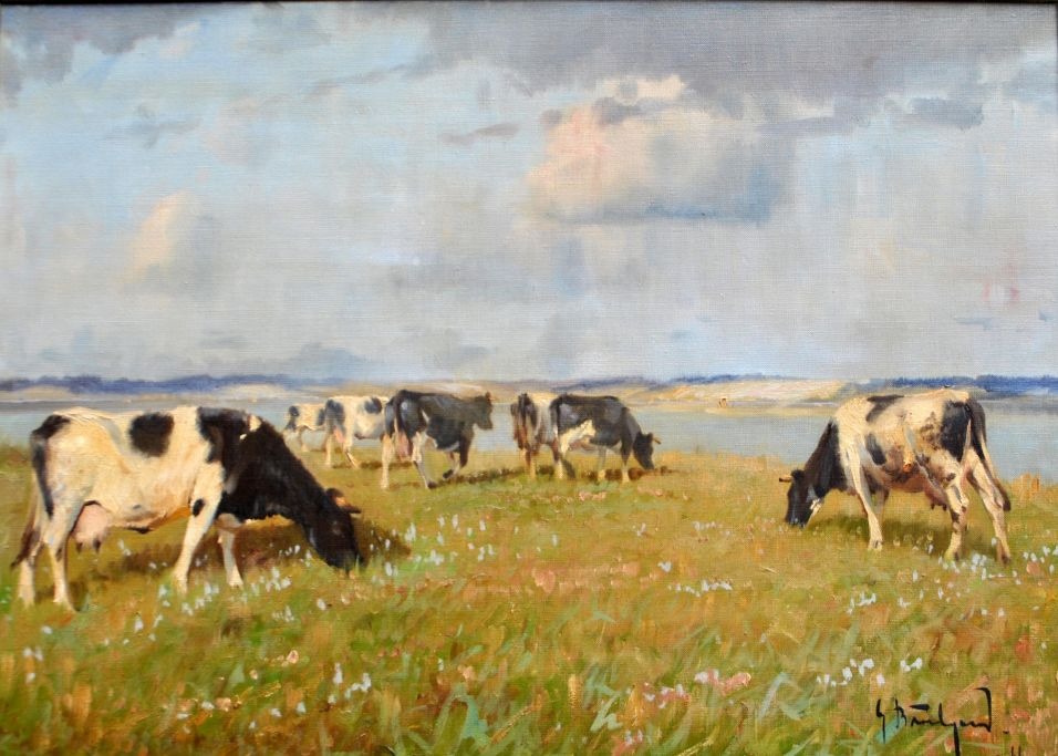 Bundgaard, Gunnar (1920 - 2005) Danmark: Køer på en mark ved en fjord. Olie på lærred. Signeret. 50 x 70 cm.