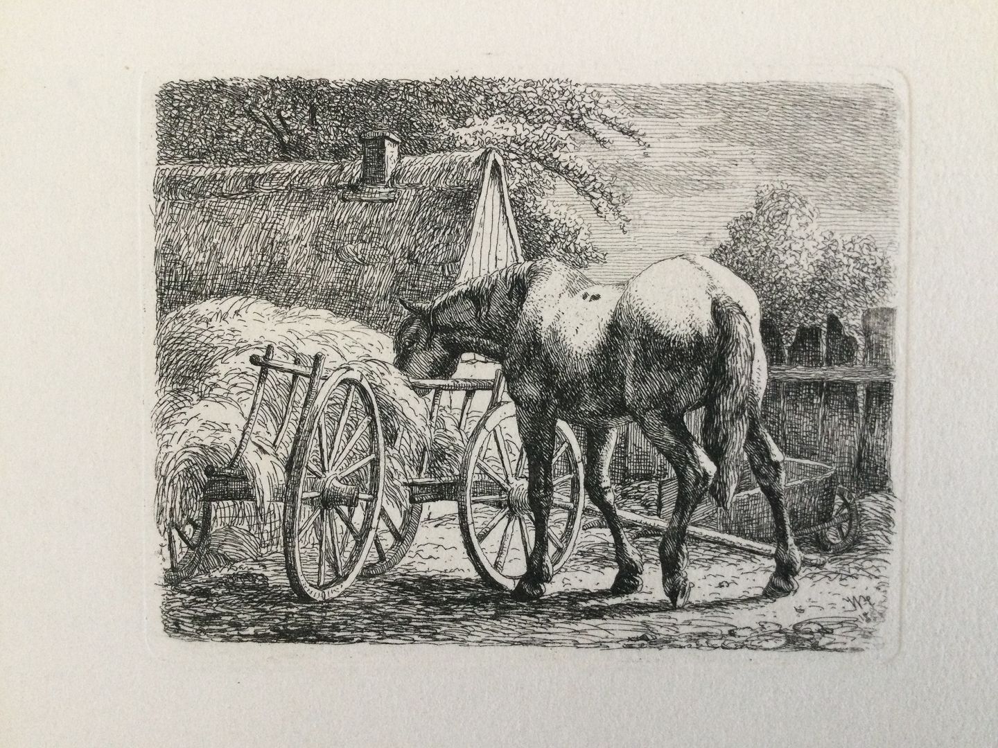 Radering af Johannes Vilhelm Zillen 1858 - Hest der æder hø fra en vogn.