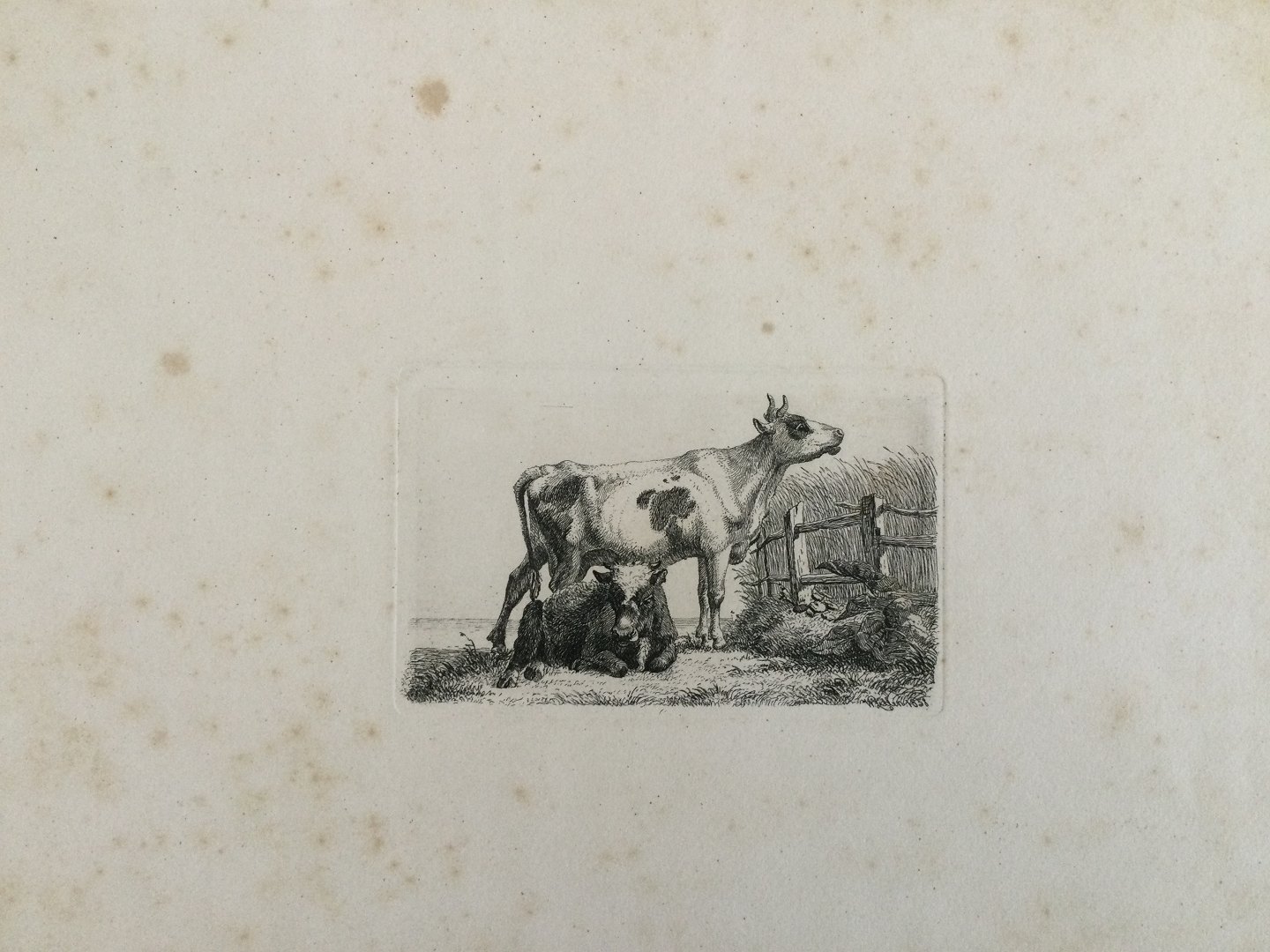 Radering af Johannes Vilhelm Zillen 1858 - En hvilende ko og en stående ko.