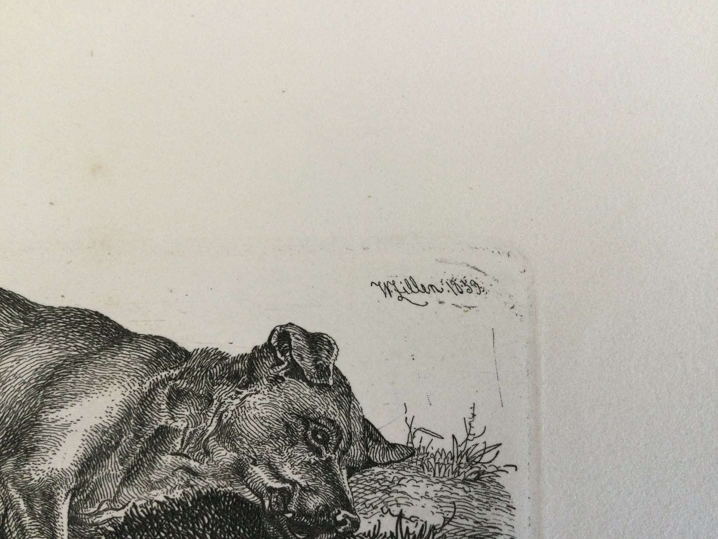 Radering af Johannes Vilhelm Zillen 1859 - En hund hvilende på marken.