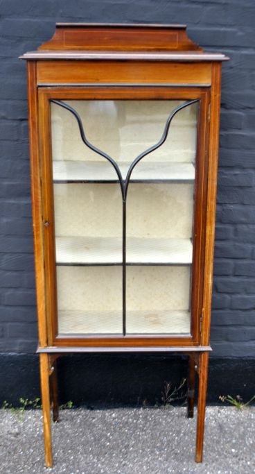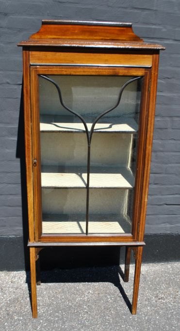 Engelsk vitrineskab i mahogni, 1920 - 1930'erne. På tilspidsede ben. Med intarsia.Med lås og nøgle. H.: 151 cm. B.: 61 cm. D.: 34 cm.
