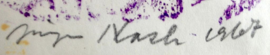 Nash, Jørgen (1920 - 2004) Danmark/Sverige: Hyldest til Den lille Havfrue.  Træsnit med violet farve. Papir. Signeret 1967. 23 x 16 cm. UNIKA.