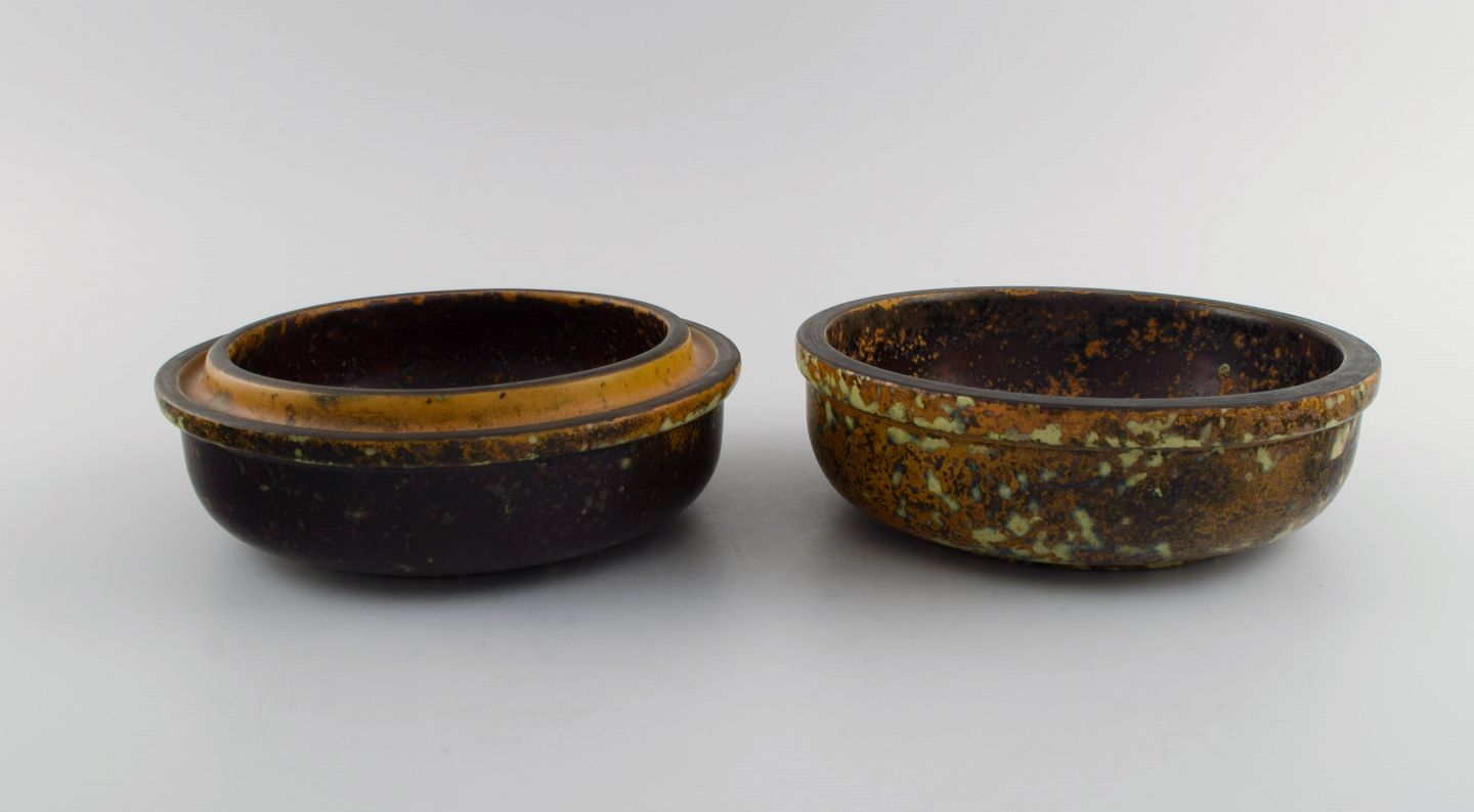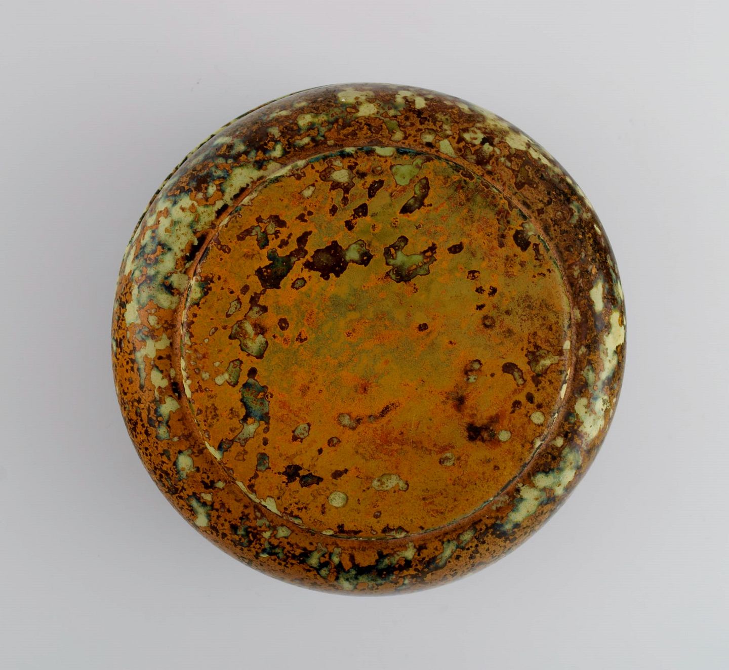 Hans Hedberg (1917-2007), Sverige. Unika Lågkrukke i glaseret keramik fra Hedbergs eget værksted i Biot, Sydfrankrig. Smuk spættet glasur i orange og lyse jordnuancer. 1980'erne.