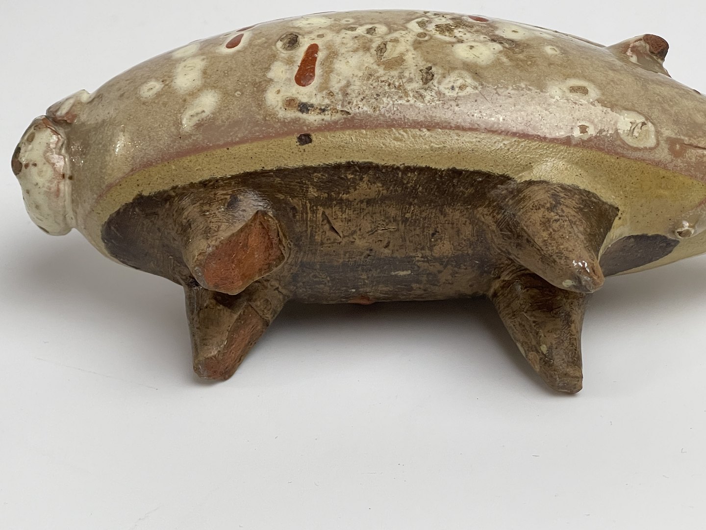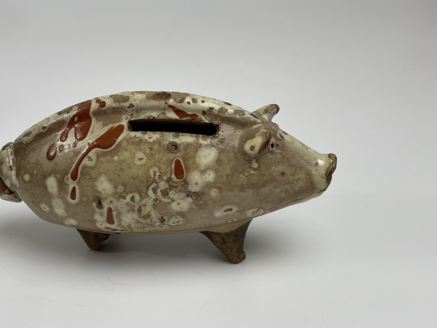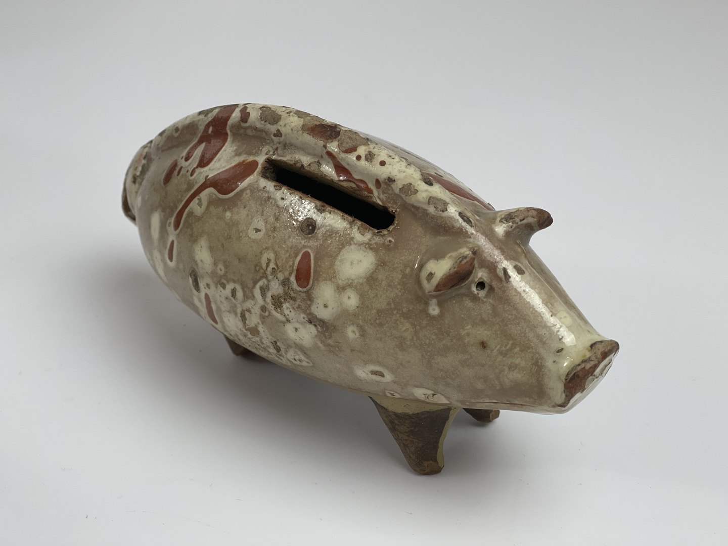 Sparegris med "kam" af lertøj og spættet glasur, charmetrold med en del patina