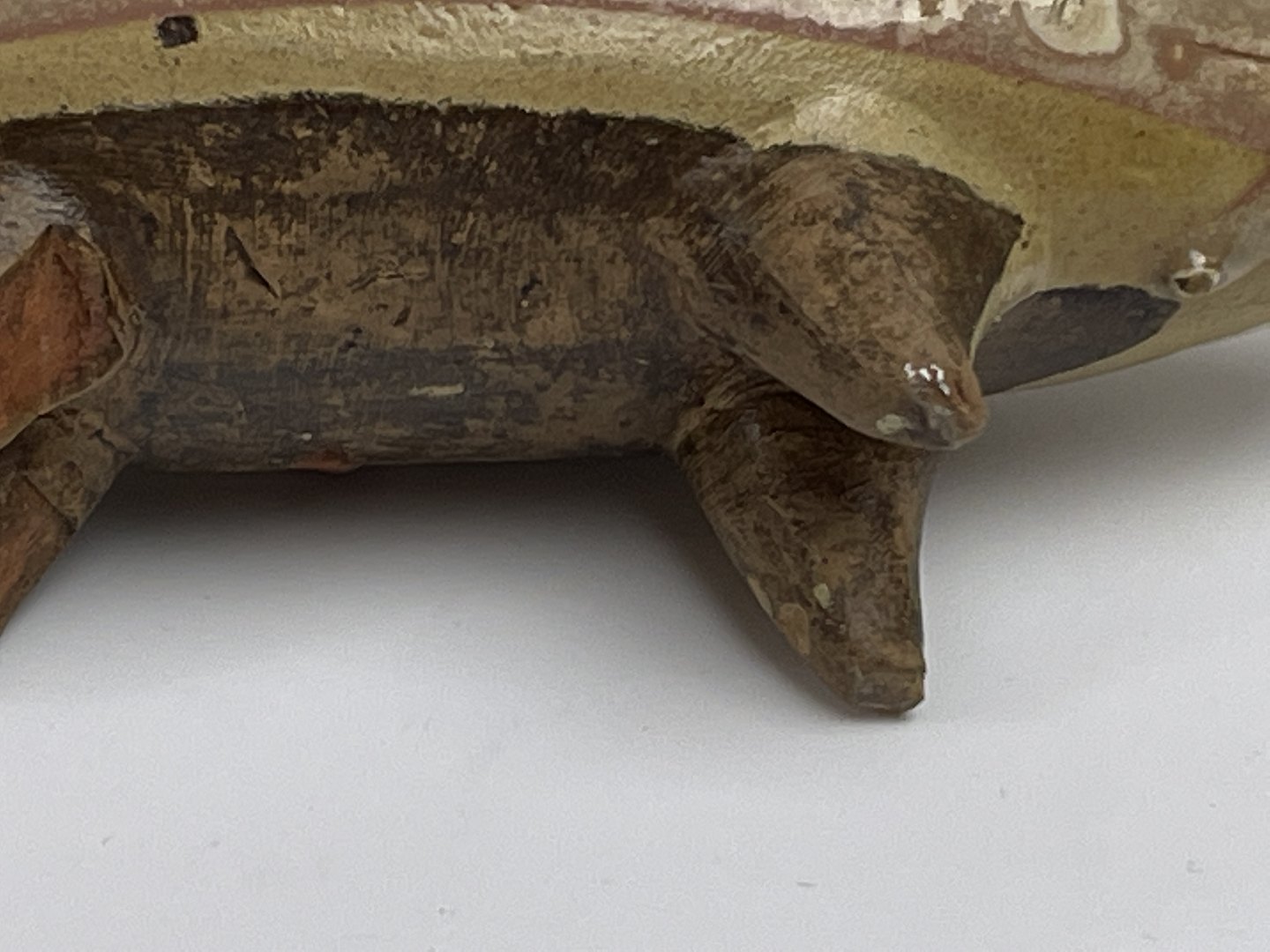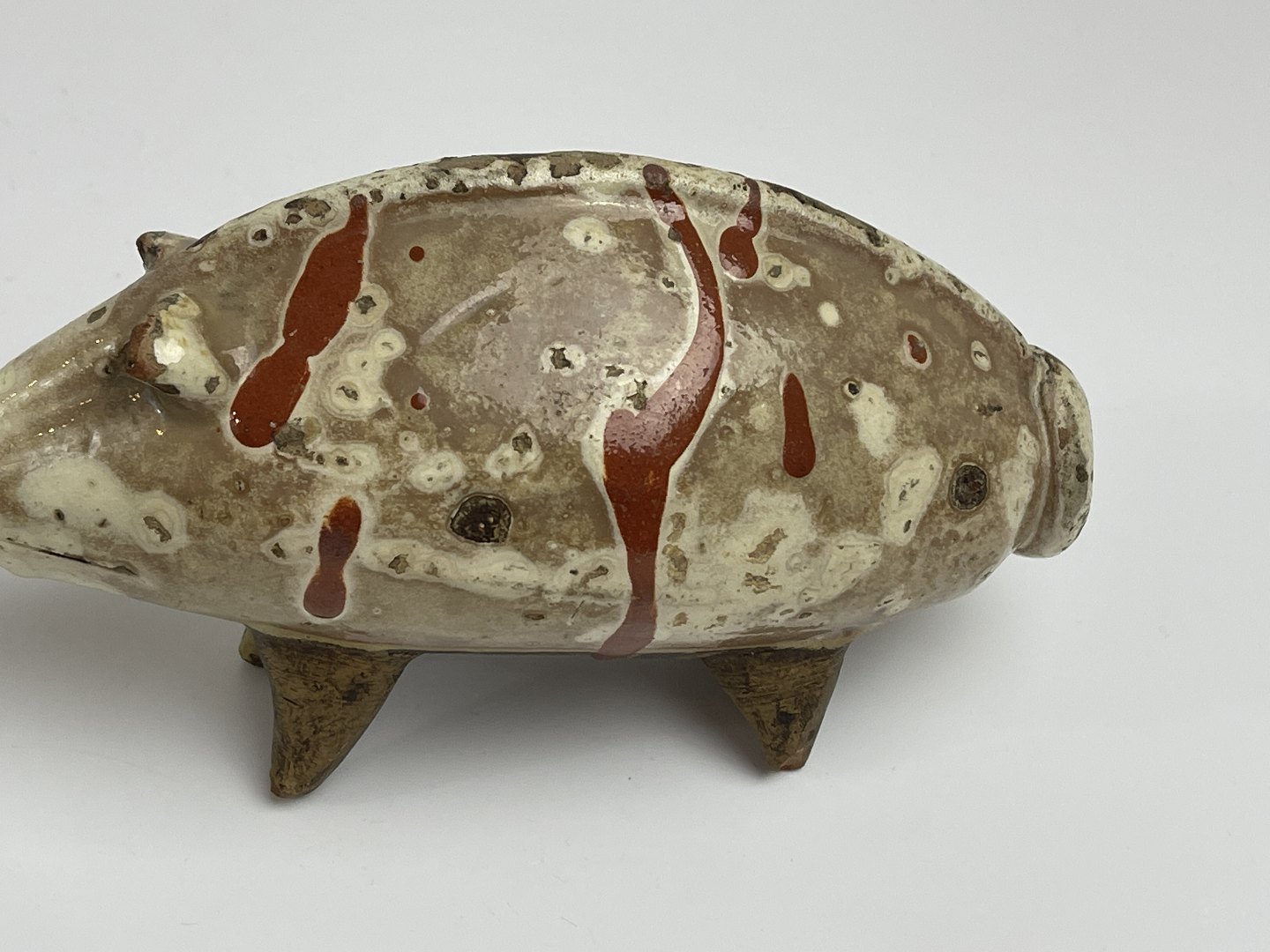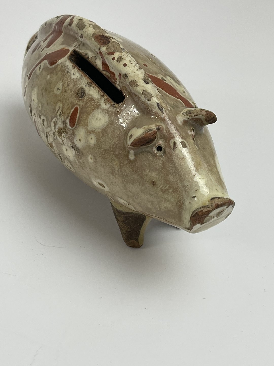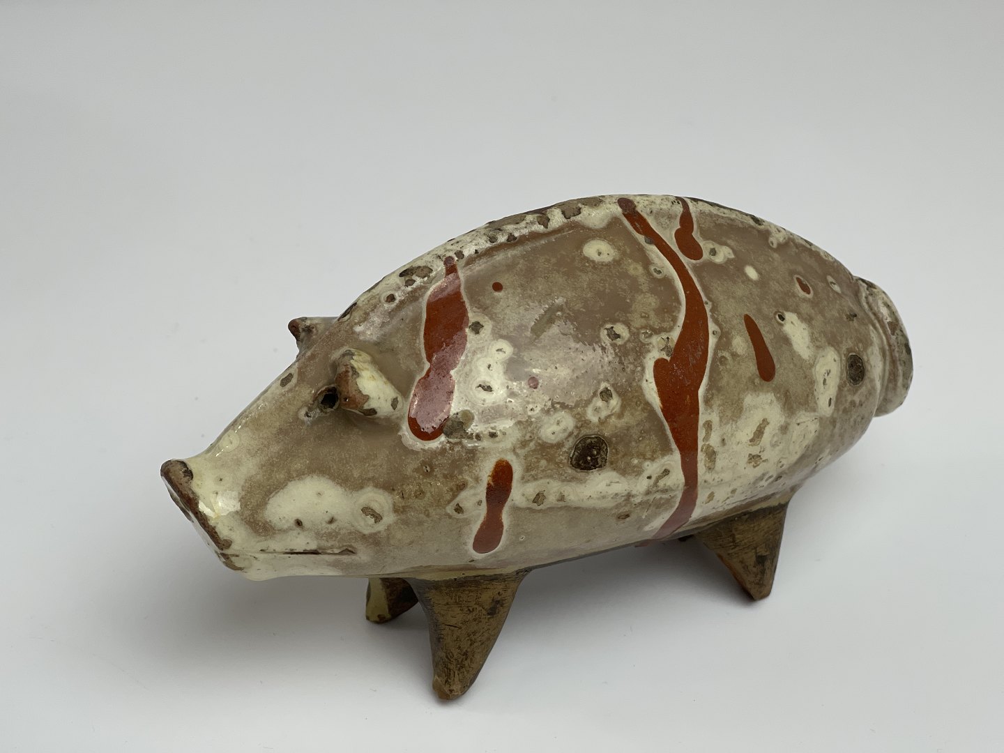 Sparegris med "kam" af lertøj og spættet glasur, charmetrold med en del patina