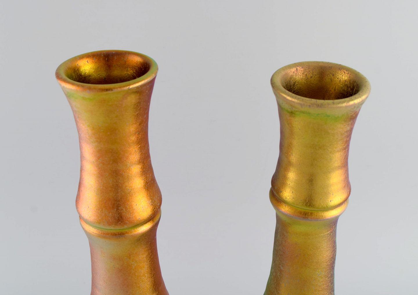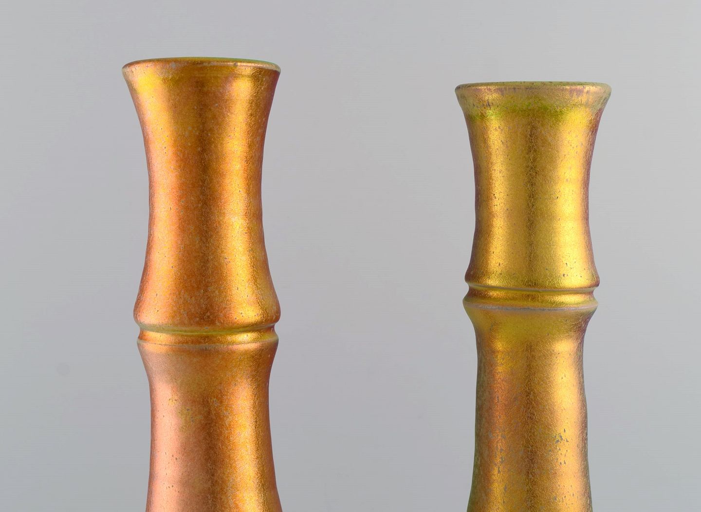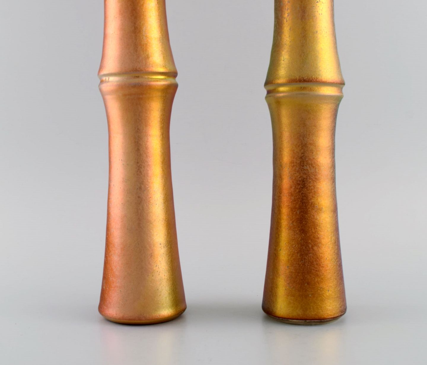 Mobach, Holland. To slanke unika vaser i glaseret keramik. Smuk eosinglasur. Midt 1900-tallet.