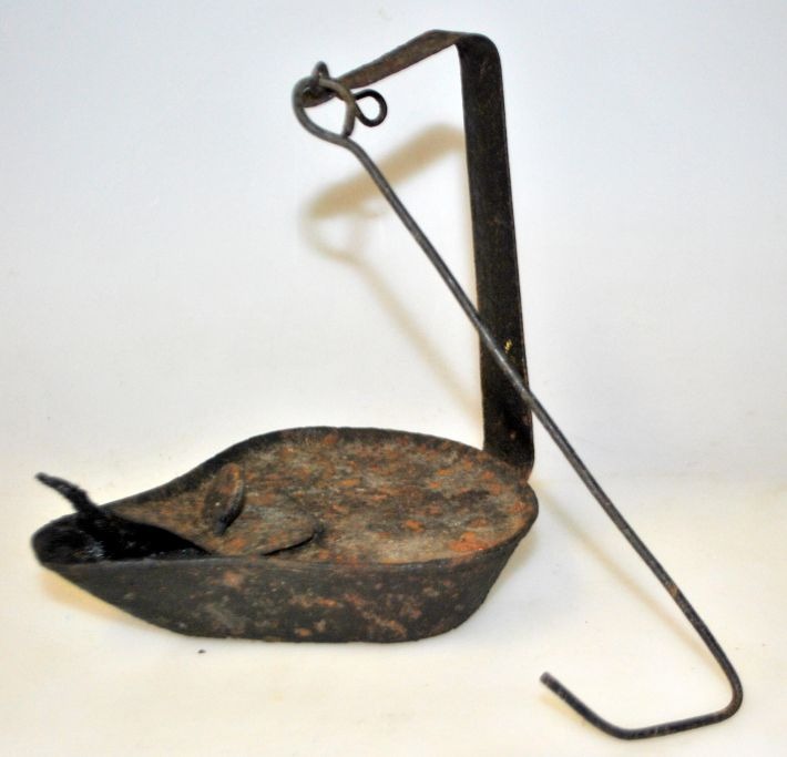 Olie/tran lampe i jernblik, 18/19. årh. Samsø, Danmark.
