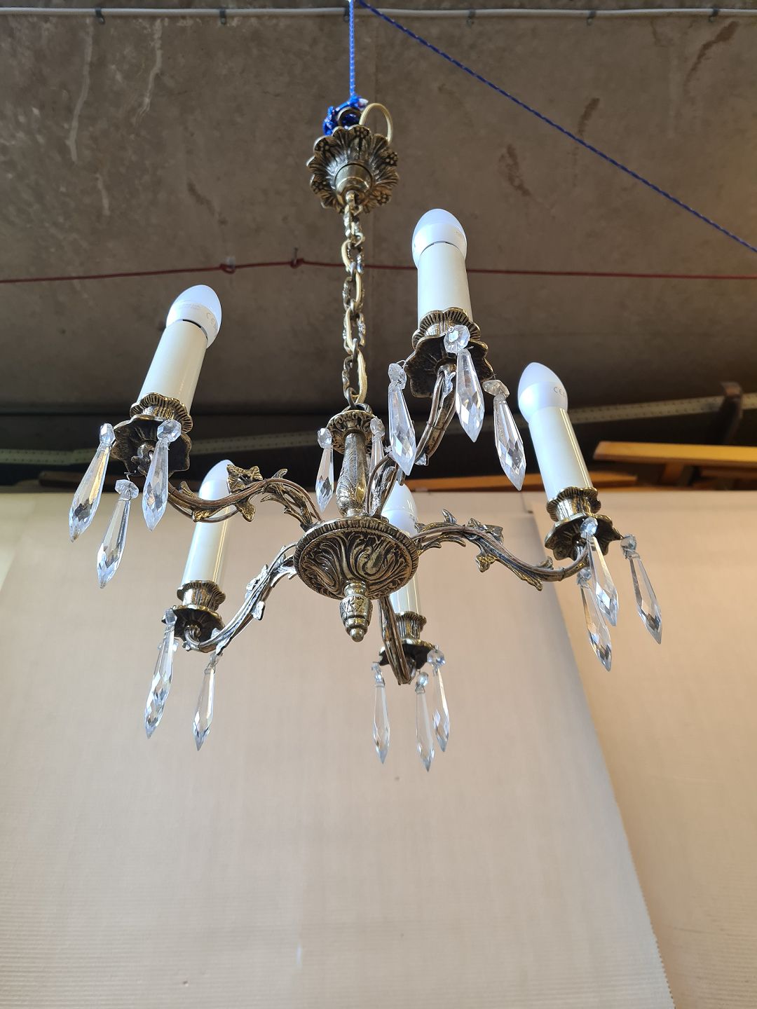 Lysekrone med prismer og 5 arme i messing, fra 1960erne.