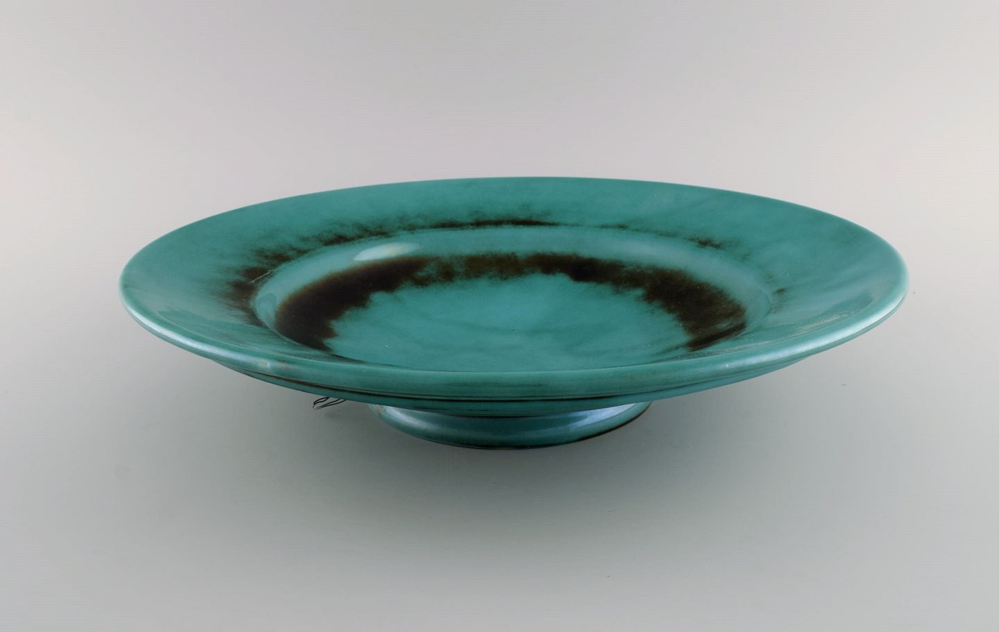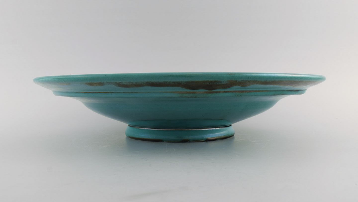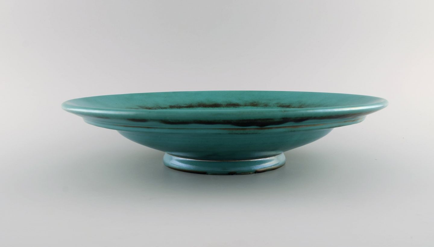 St. Erik, Upsala. Stor art deco skål / fad i glaseret keramik. Smuk glasur i grønne nuancer. 1930'erne.