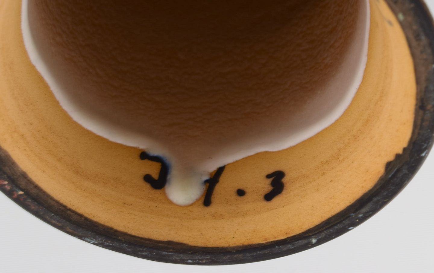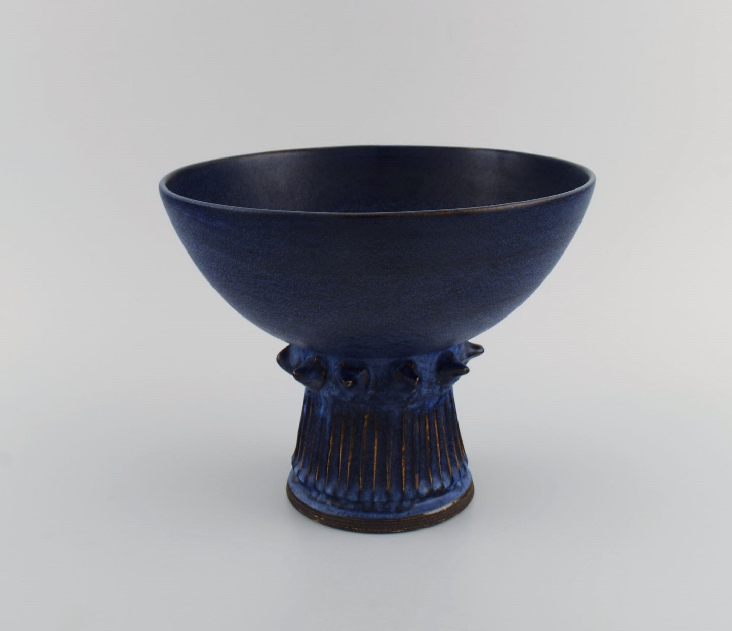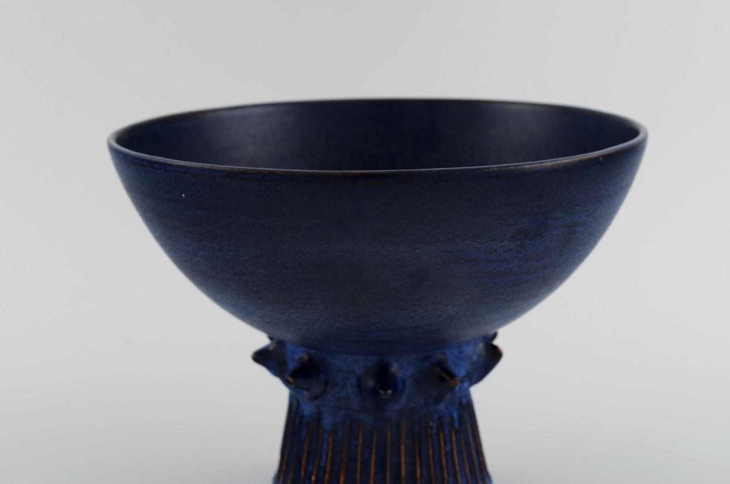 Irma Yourstone (1911-1988), Sverige. Skål på fod i glaseret stentøj. Smuk glasur i dybe blå nuancer. 1960'erne.