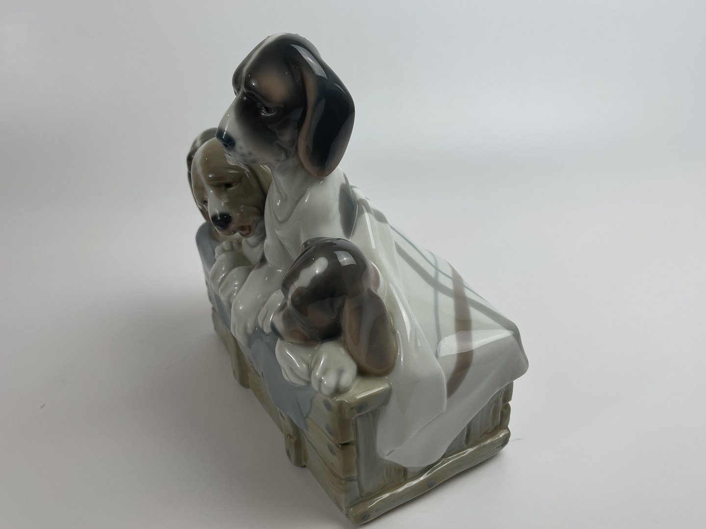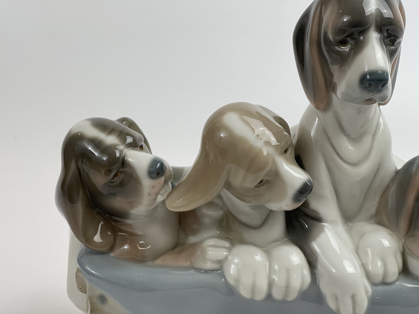 Lladro figur med hunde, formentlig af Juan Huerta, 4 hvalpe med tæppe over sig sidder på en "trækasse", 20. århundrede