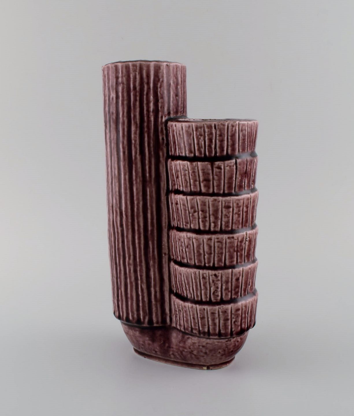 Gunnar Nylund (1904-1997) for Rörstrand. Chamotte vase i glaseret keramik. Smuk glasur i lysviolette nuancer. Midt 1900-tallet.