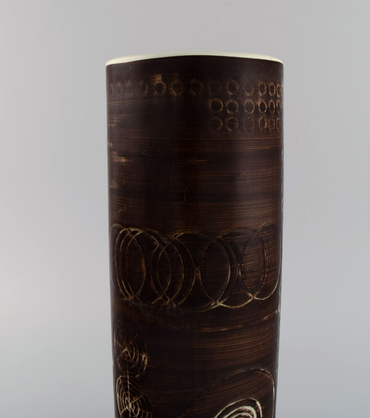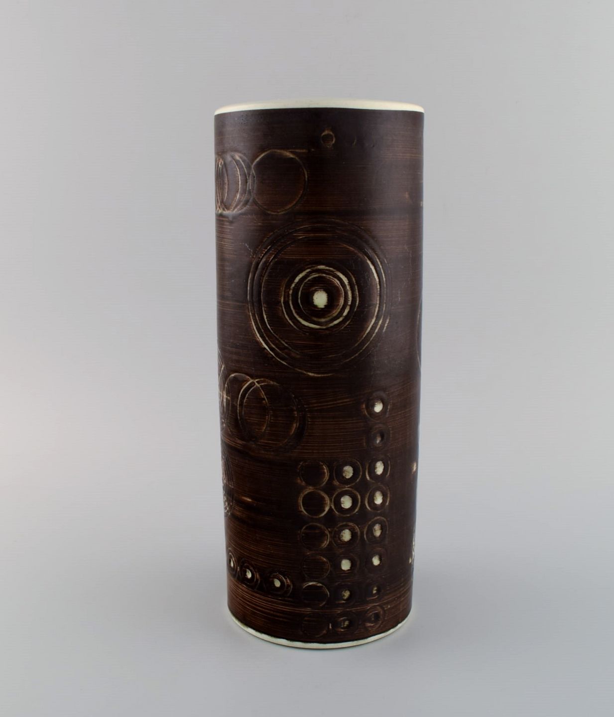 Olle Alberius for Rörstrand. Stor cylindrisk Sarek vase i håndmalet og glaseret keramik med geometriske mønstre. Svensk design, 1960/70'erne.