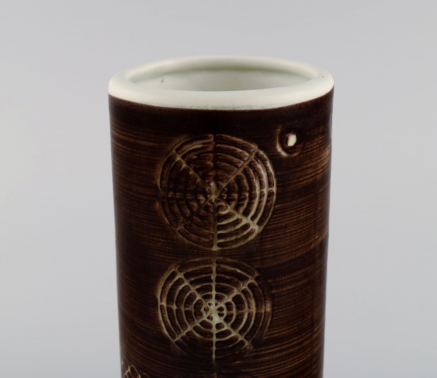 Olle Alberius for Rörstrand. Cylindrisk Sarek vase i håndmalet og glaseret keramik med geometriske mønstre. Svensk design, 1960/70'erne.