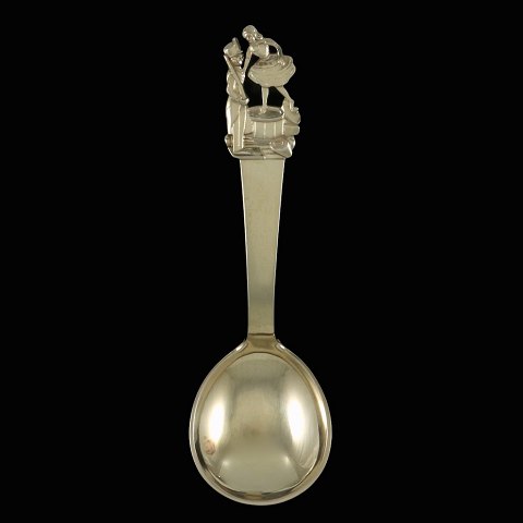 Rund barne/dessert-ske i forgyldt sølv med motiv fra H.C. Andersens eventyr.
