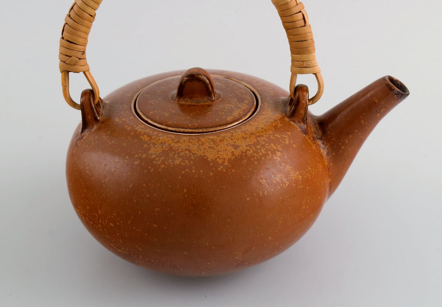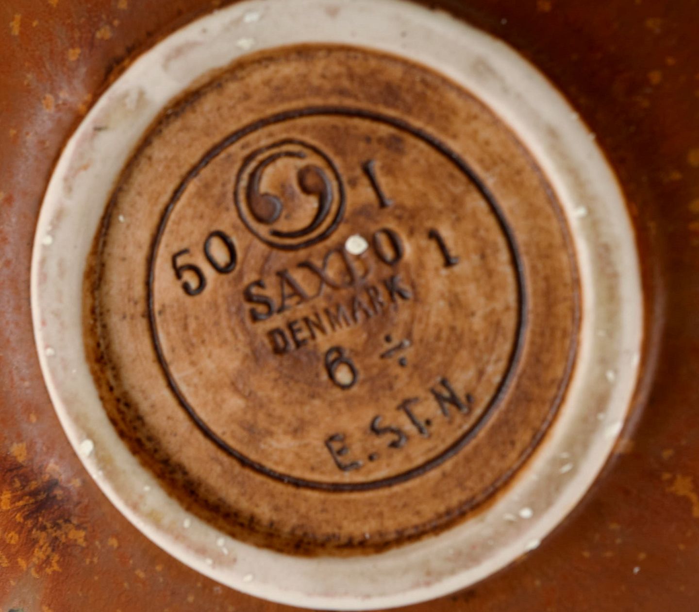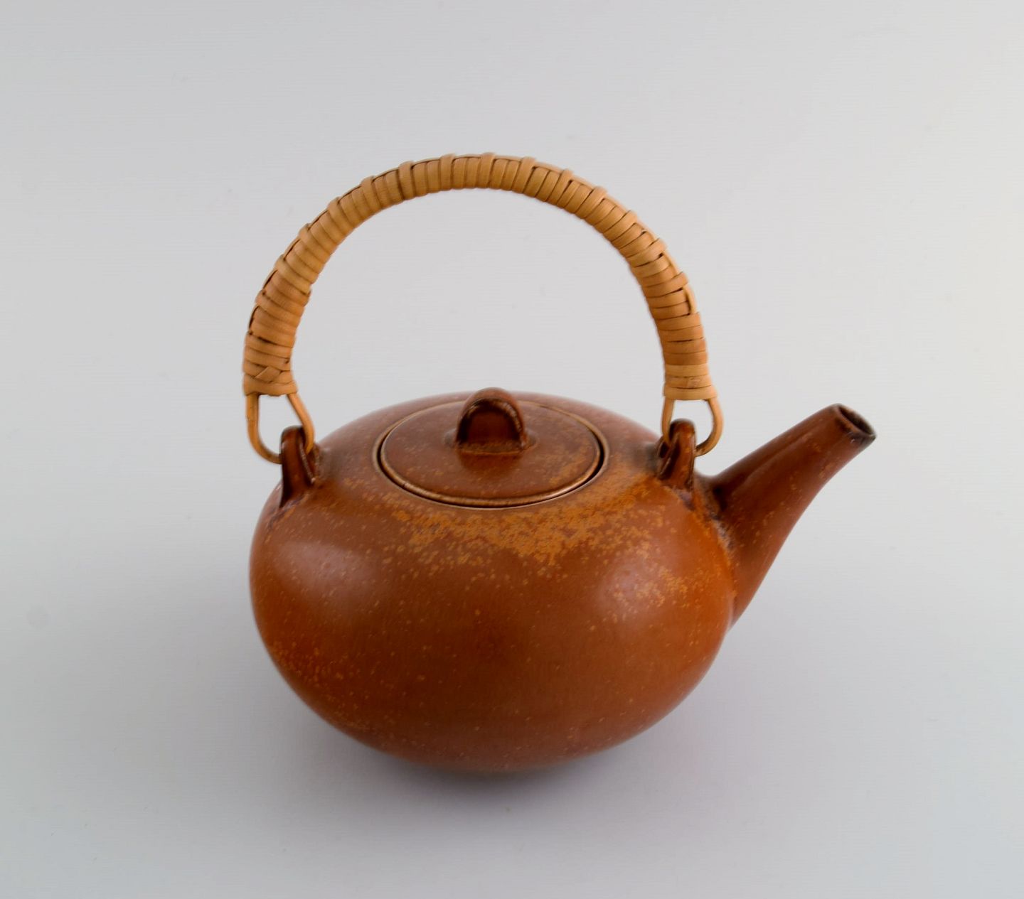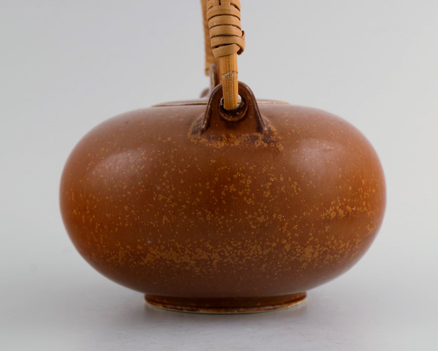 Eva Stæhr-Nielsen for Saxbo. Tekande i glaseret stentøj med flettet hank. Smuk glasur i rødbrune nuancer. Midt 1900-tallet.