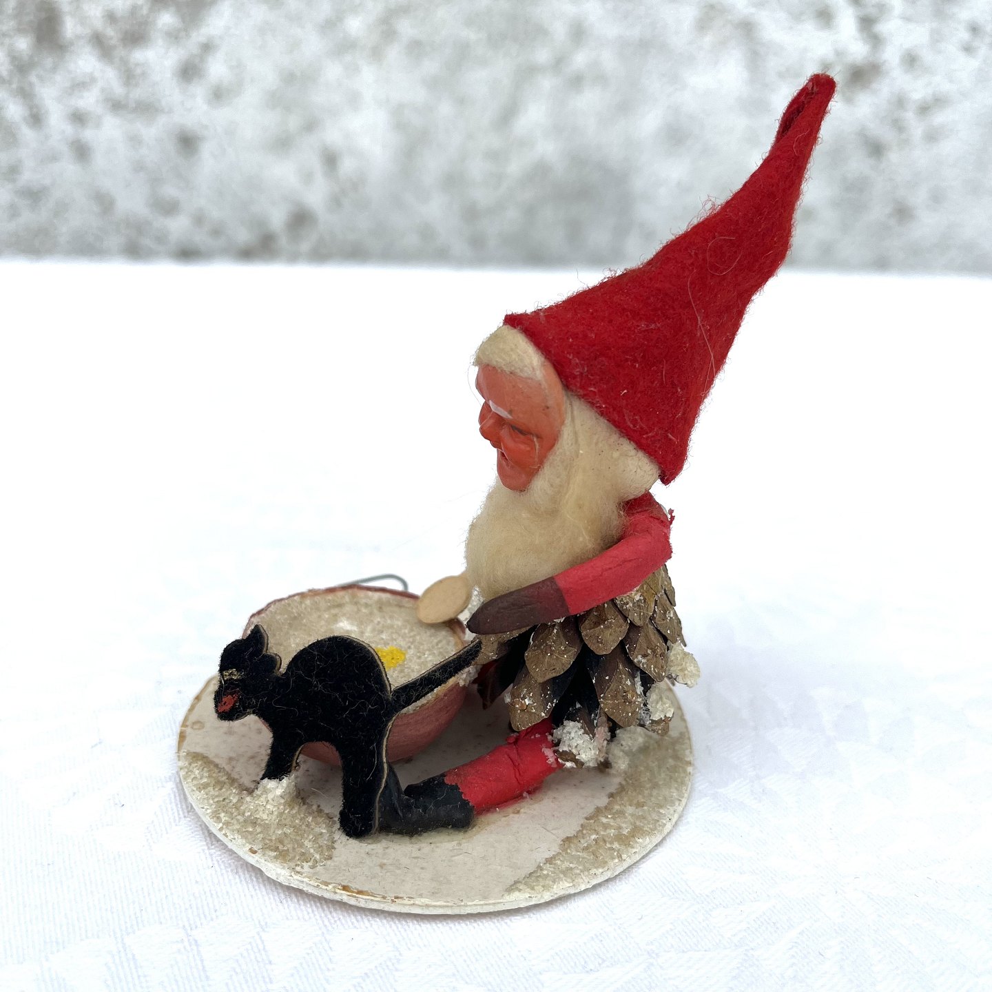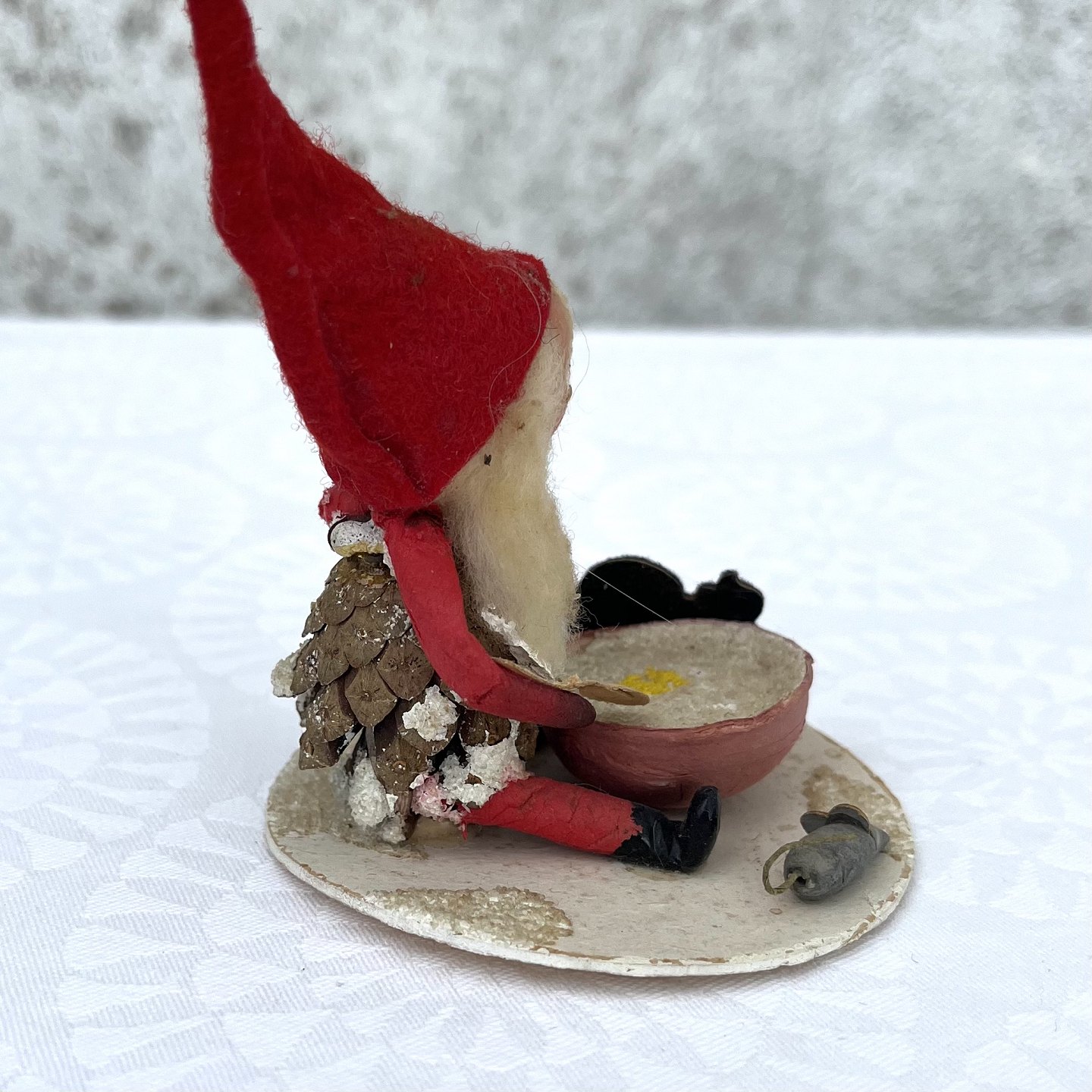 Retro, Kogle / gummihoved nisse tableau, Med kat, mus og grød, 10cm høj *pæn patineret stand*