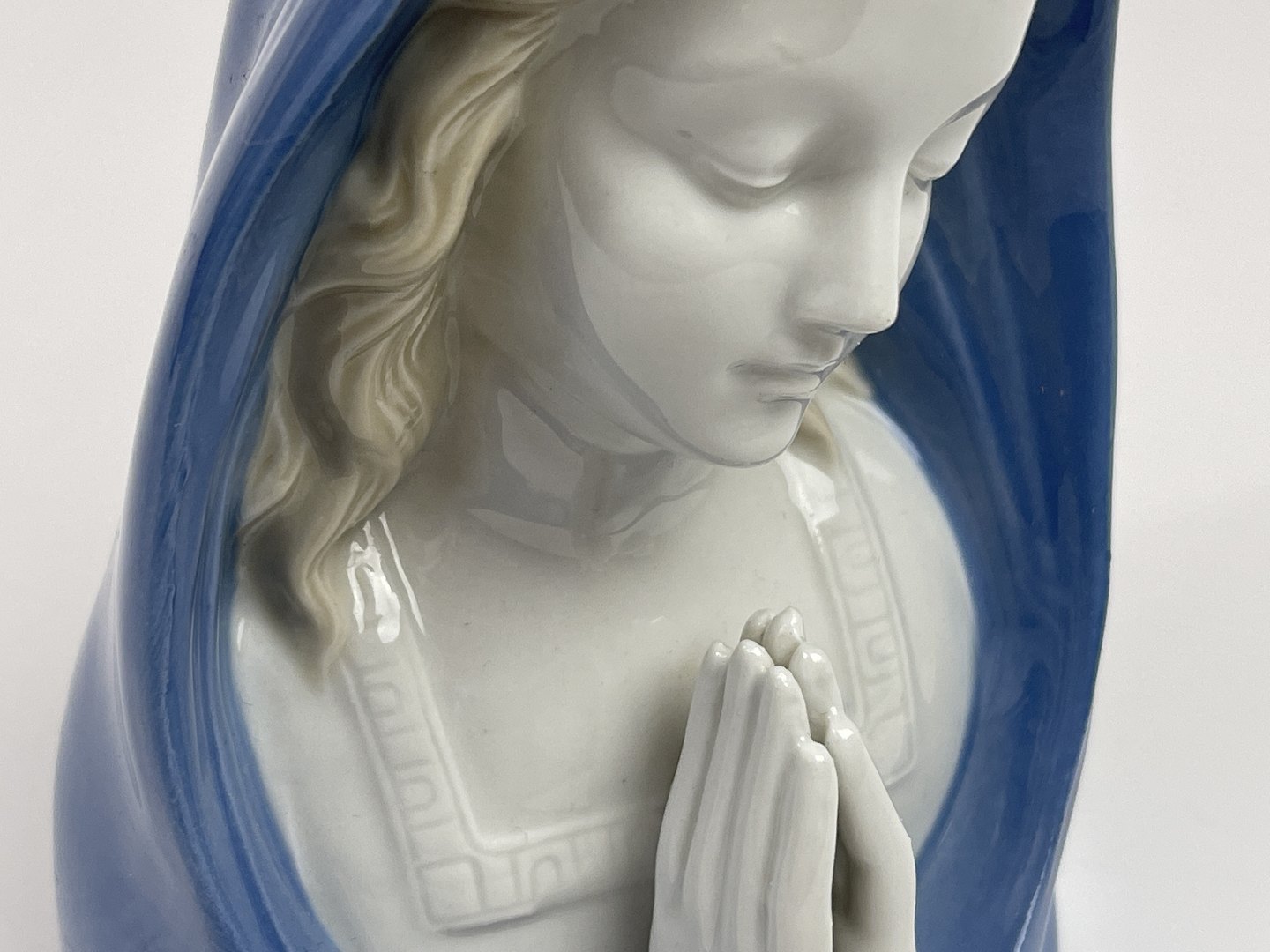Lille porcelænsbuste af Madonna med foldede hænder i bøn. Figuren er stemplet WA med krone for porcelænsfabrikken Wagner & Apel, Lippelsdorf, Thüringen, 1940'erne.