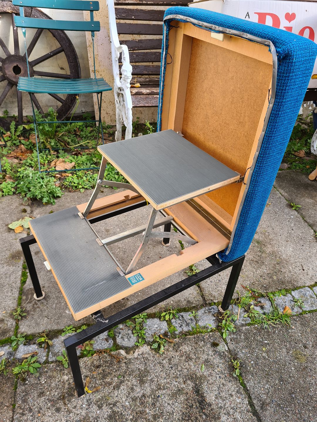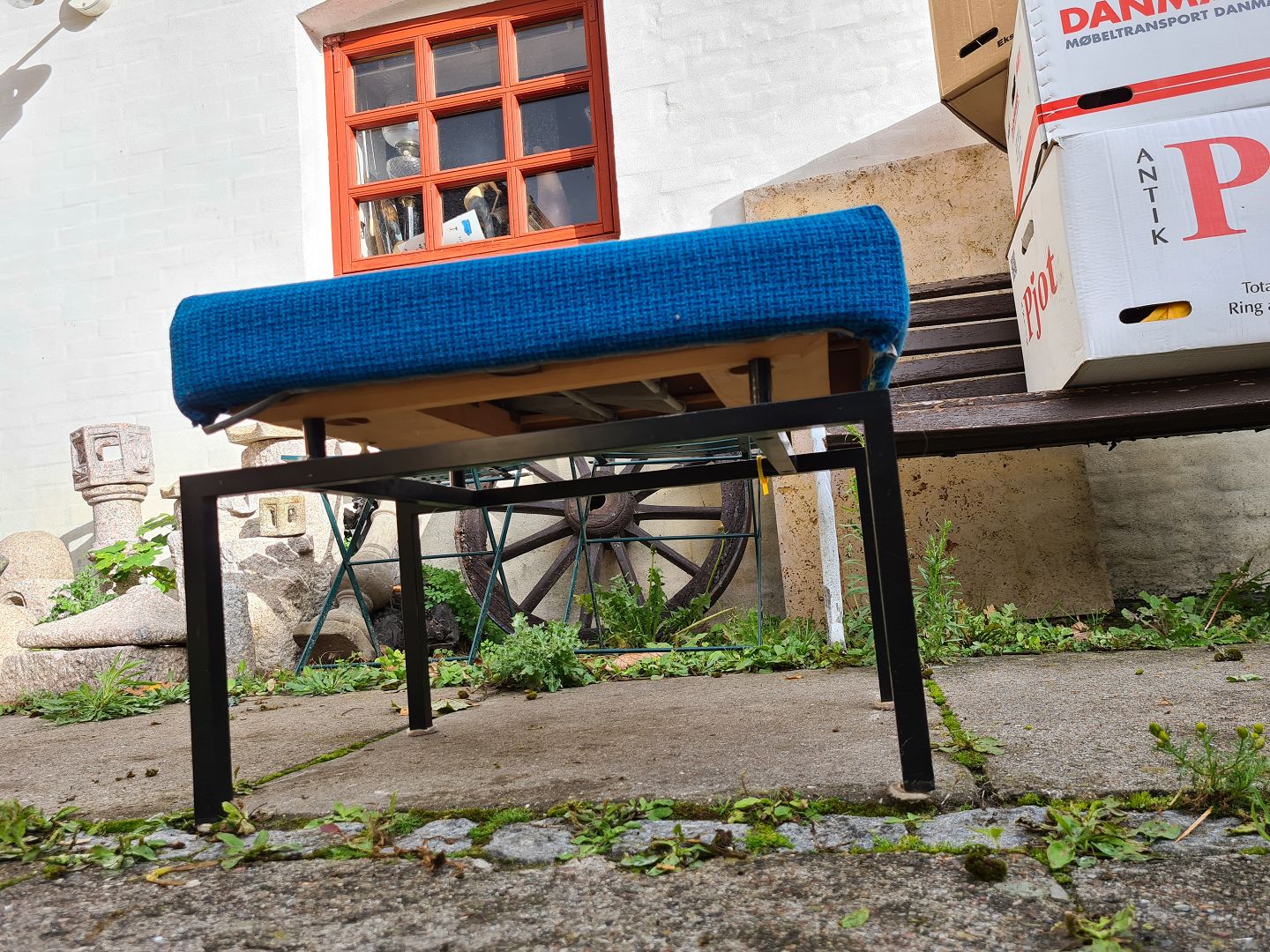 Taburet i metal med blåt stof på sædet fra 1970´erne. Kan hurtigt laves om til en lille trappestige. Fremstår udmærket funktionel.