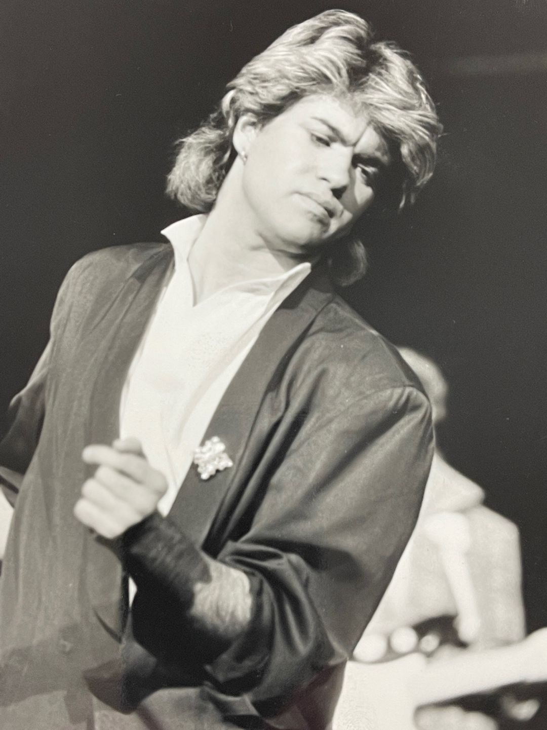 Originalt sort-hvidt pressefoto af George Michael fra Wham under sidstnævntes tour i Kina i 1985. Fotograf: Neal Preston. Wham var et første rockgruppe fra Vesten, der fik lov til at optræde i Kina - læse artikel fra BBC om koncerten: