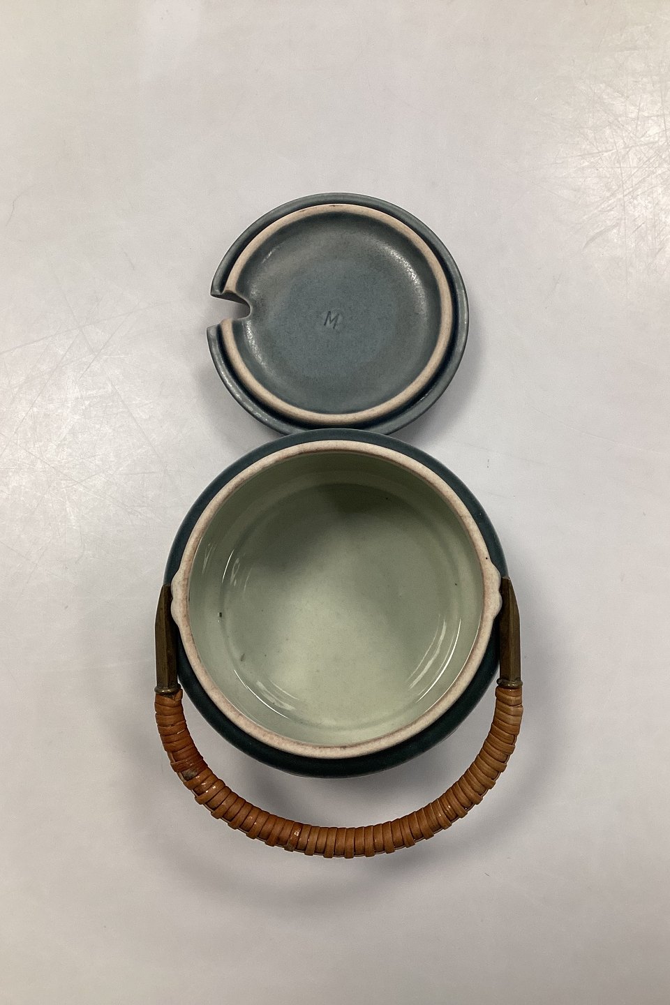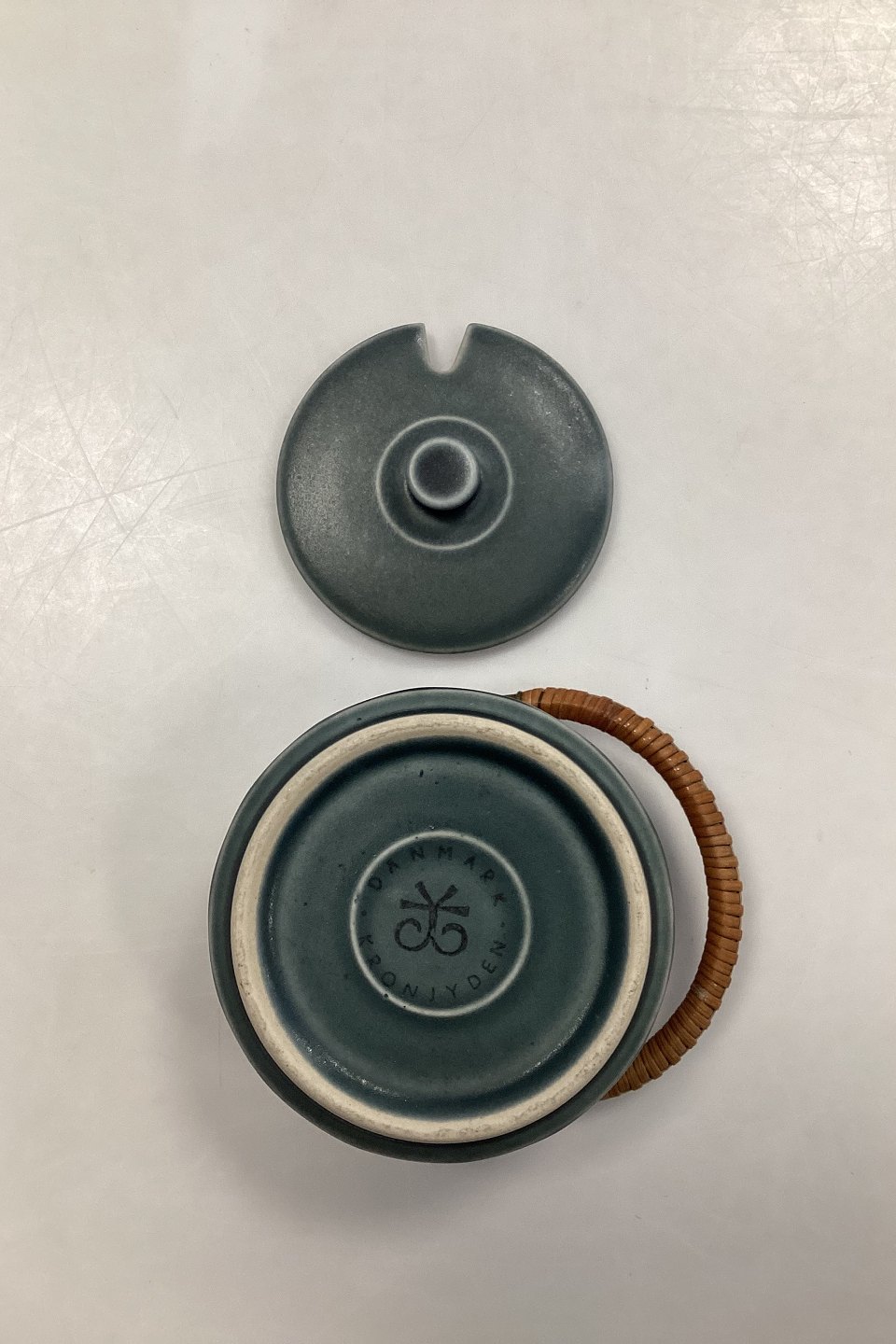 Bing og Grøndahl/Kronjyden Grøn Azur Marmeladekrukke med låg og basthank. Måler 10,5 cm x 7 cm