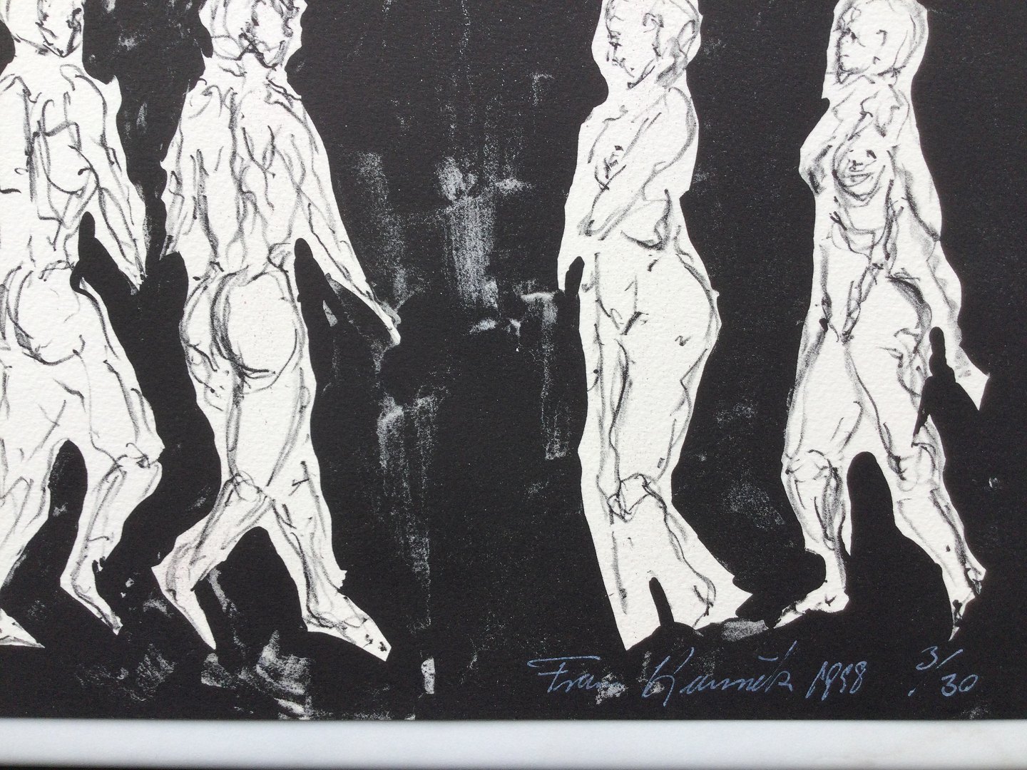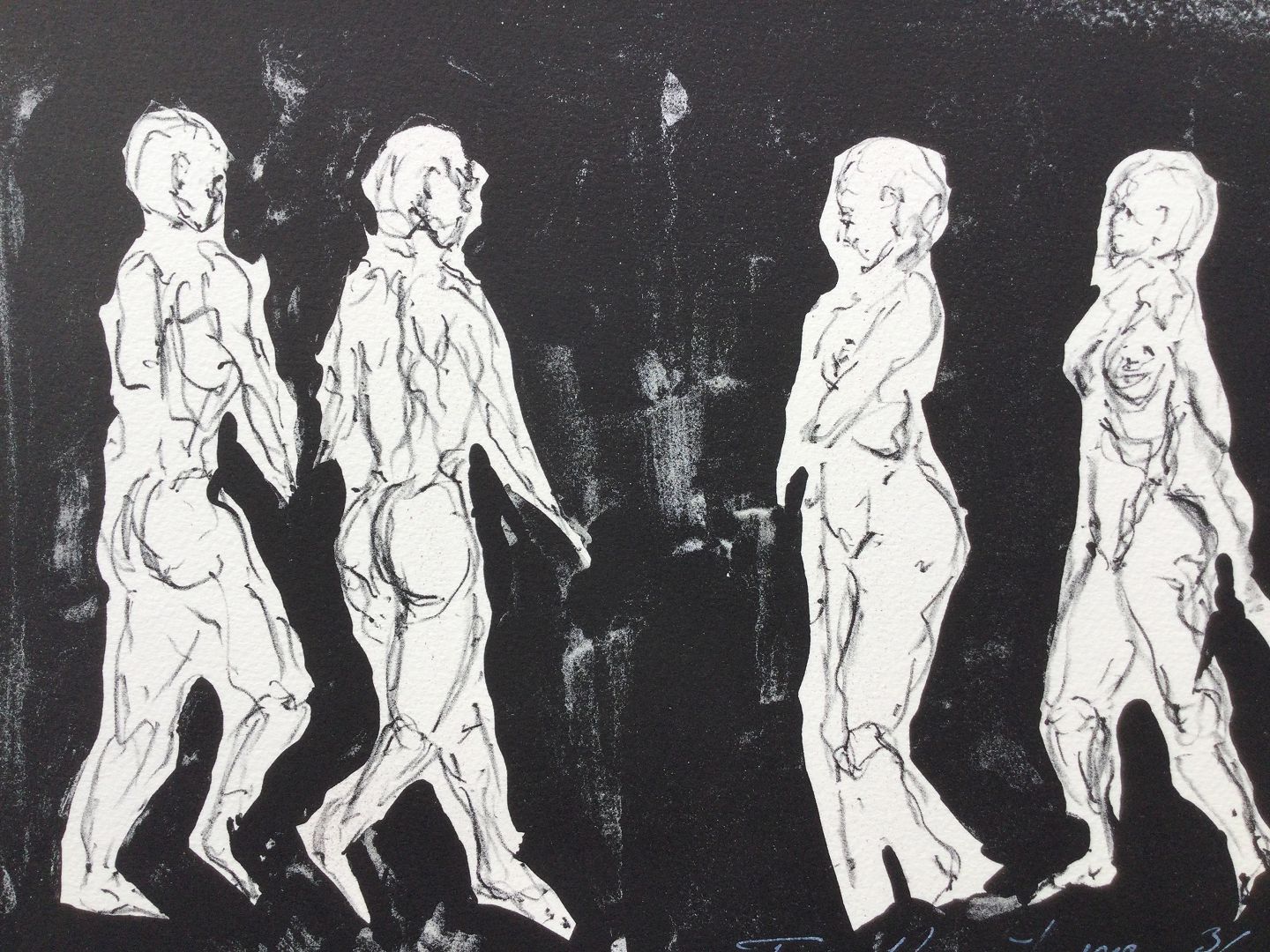 Farvelitografi af Frans Kannik 1998 - Komposition med gående personer.