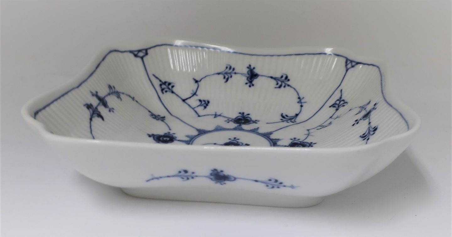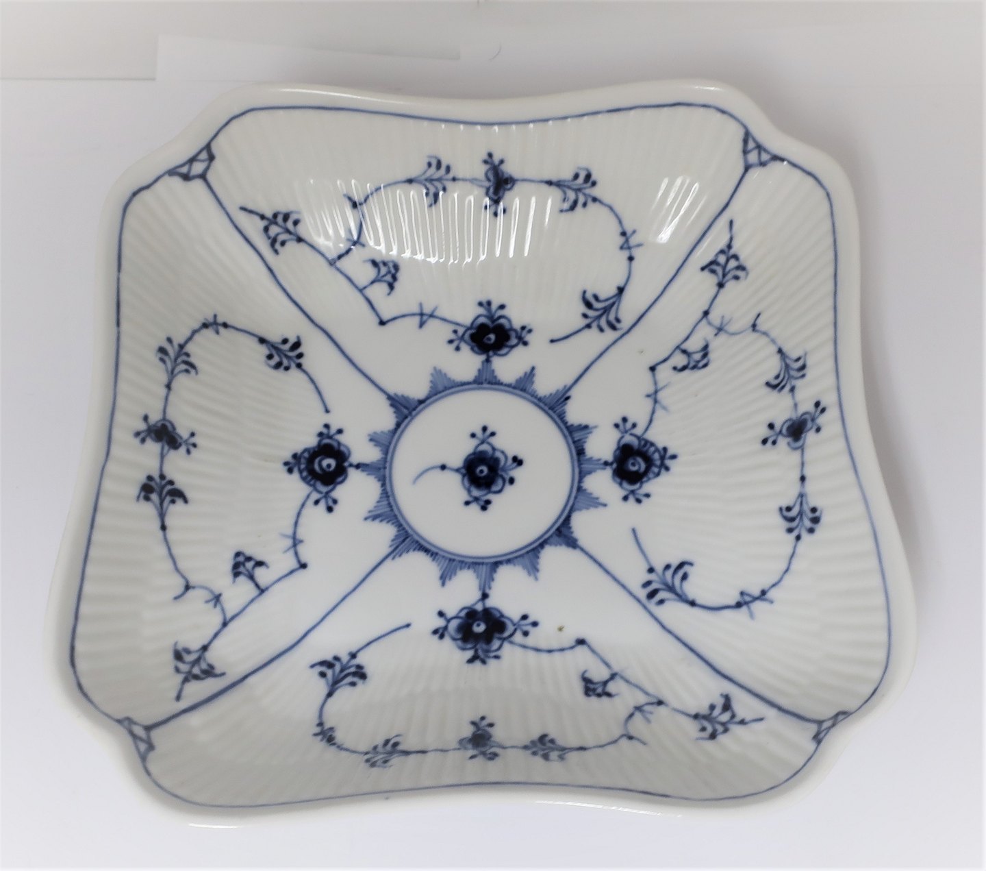 Royal Copenhagen. Musselmalet, riflet. Firkantet skål. Model 26. Bredde 21 cm. (3 sortering)