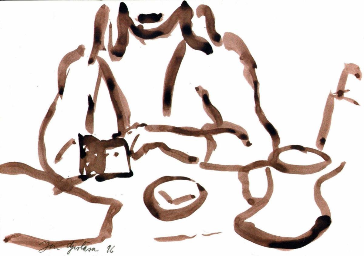 Gislason, Jon (1955-): Kvinde ved bord. Akvarel på papir. Sign.:Jon Gislason 96. 29,5 x 42 cm.