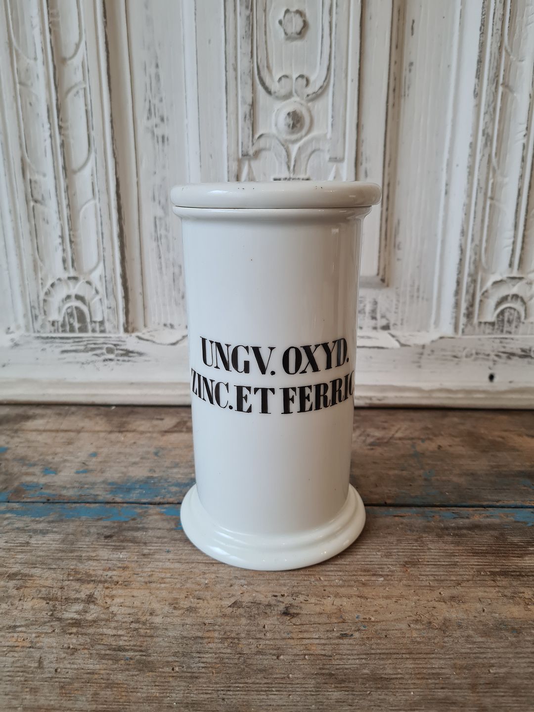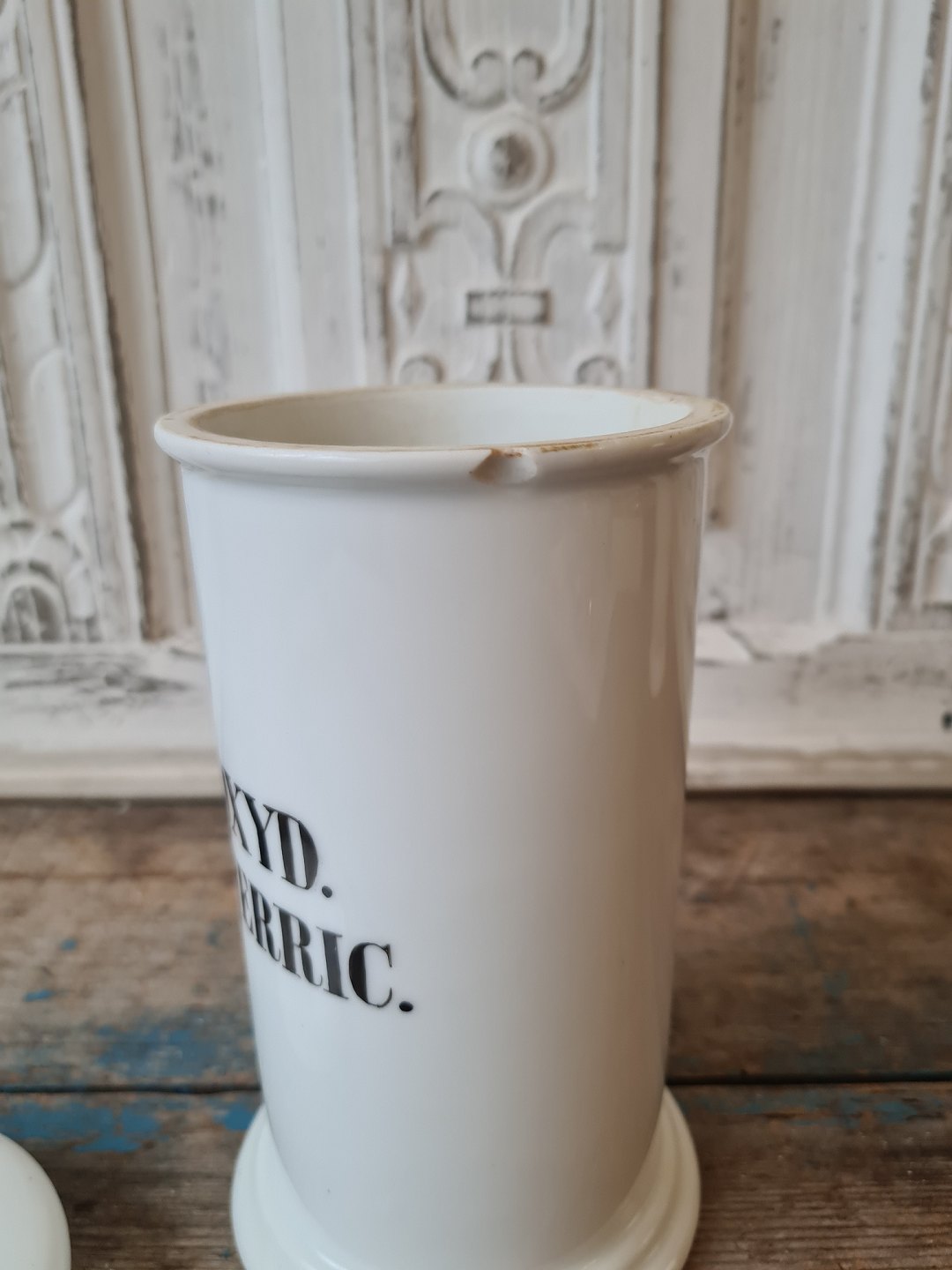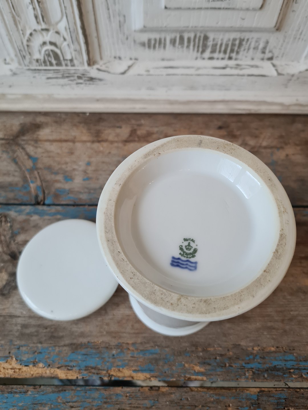 Royal Copenhagen Apotekerkrukke i hvidt porcelæn med sort skrift