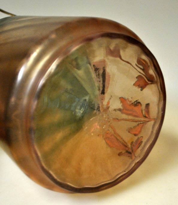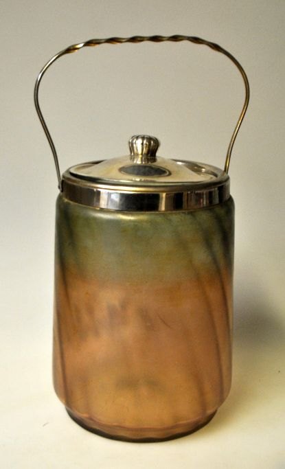 Bisquit spand, ca. 1900. Irriseret bemalet glas med emeljedekoration med blomster. Hank og låb i nikkel. H.: 19 cm. Højde med hank: 26 cm.