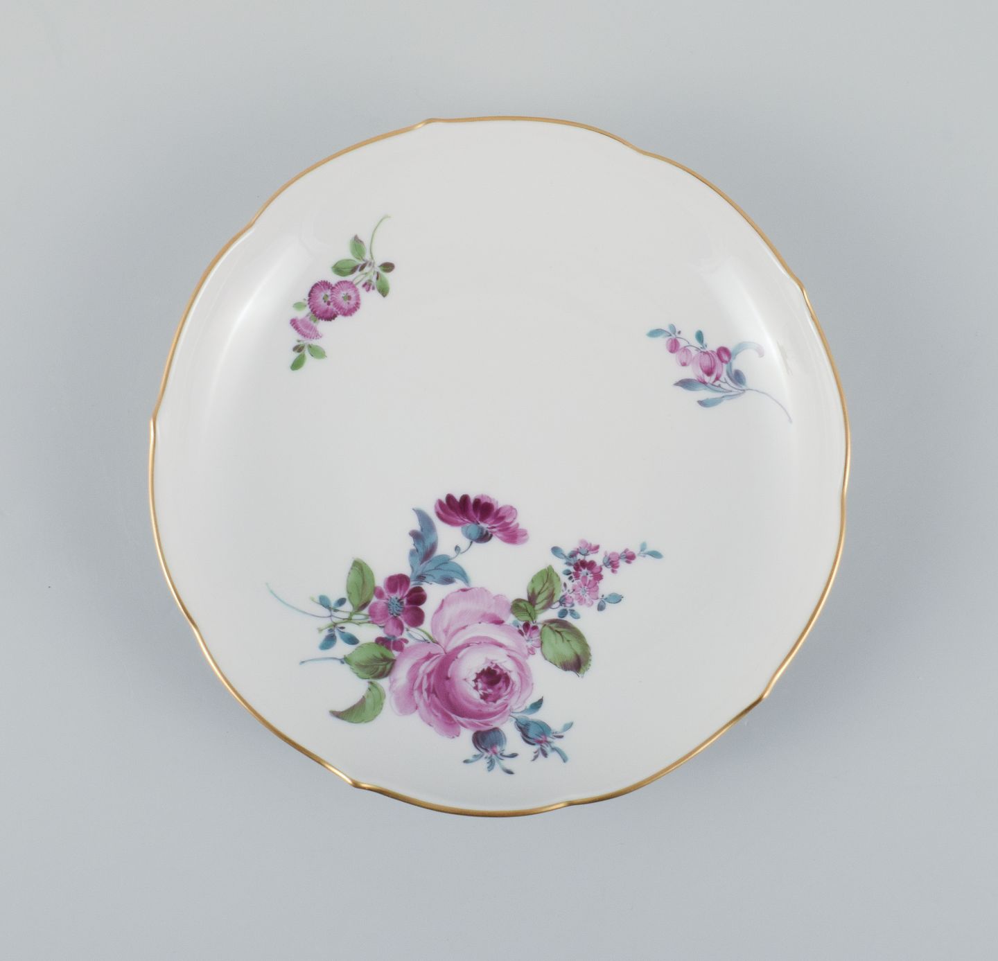 Seks antikke Meissen tallerkner, håndmalede med polykrome blomster og guldkant.