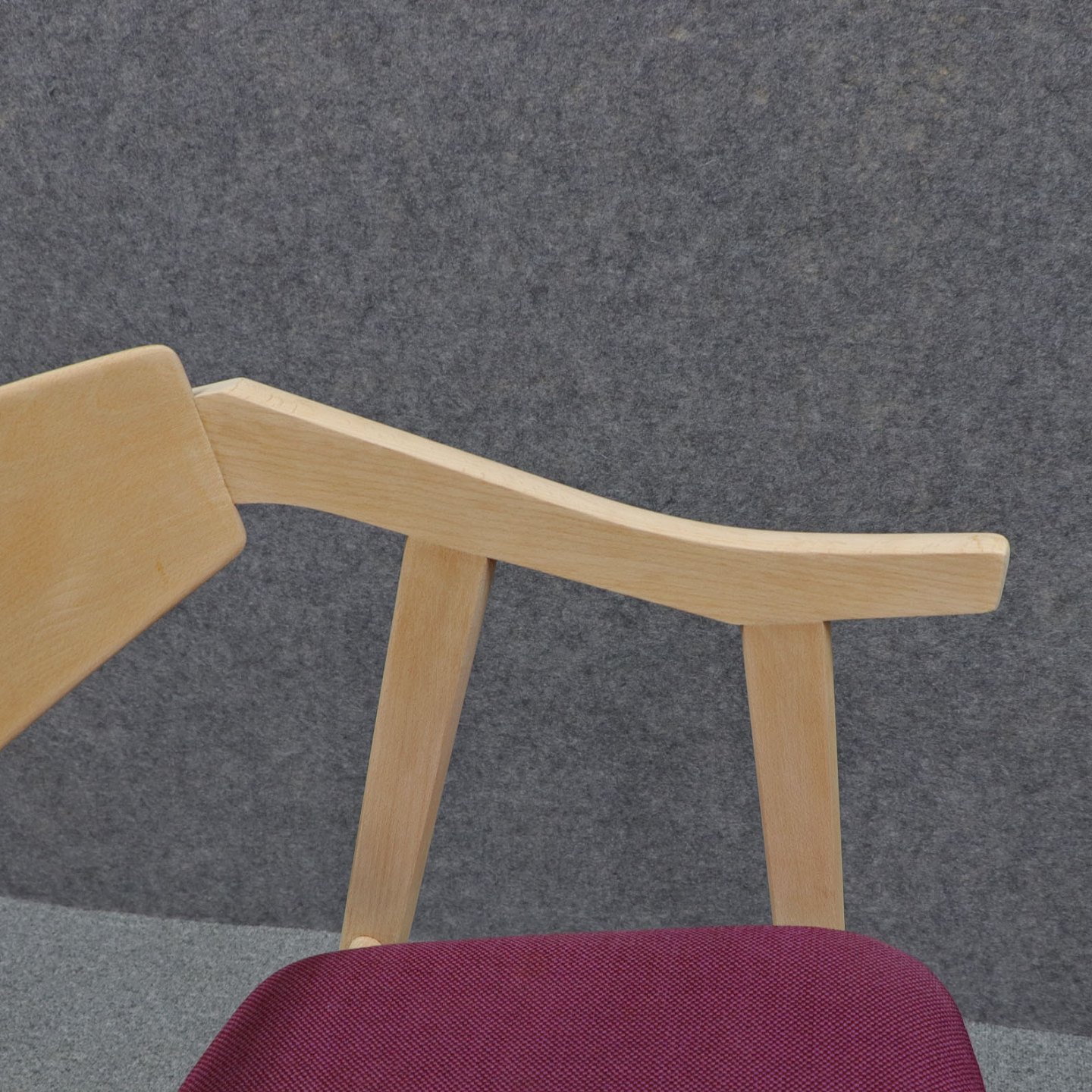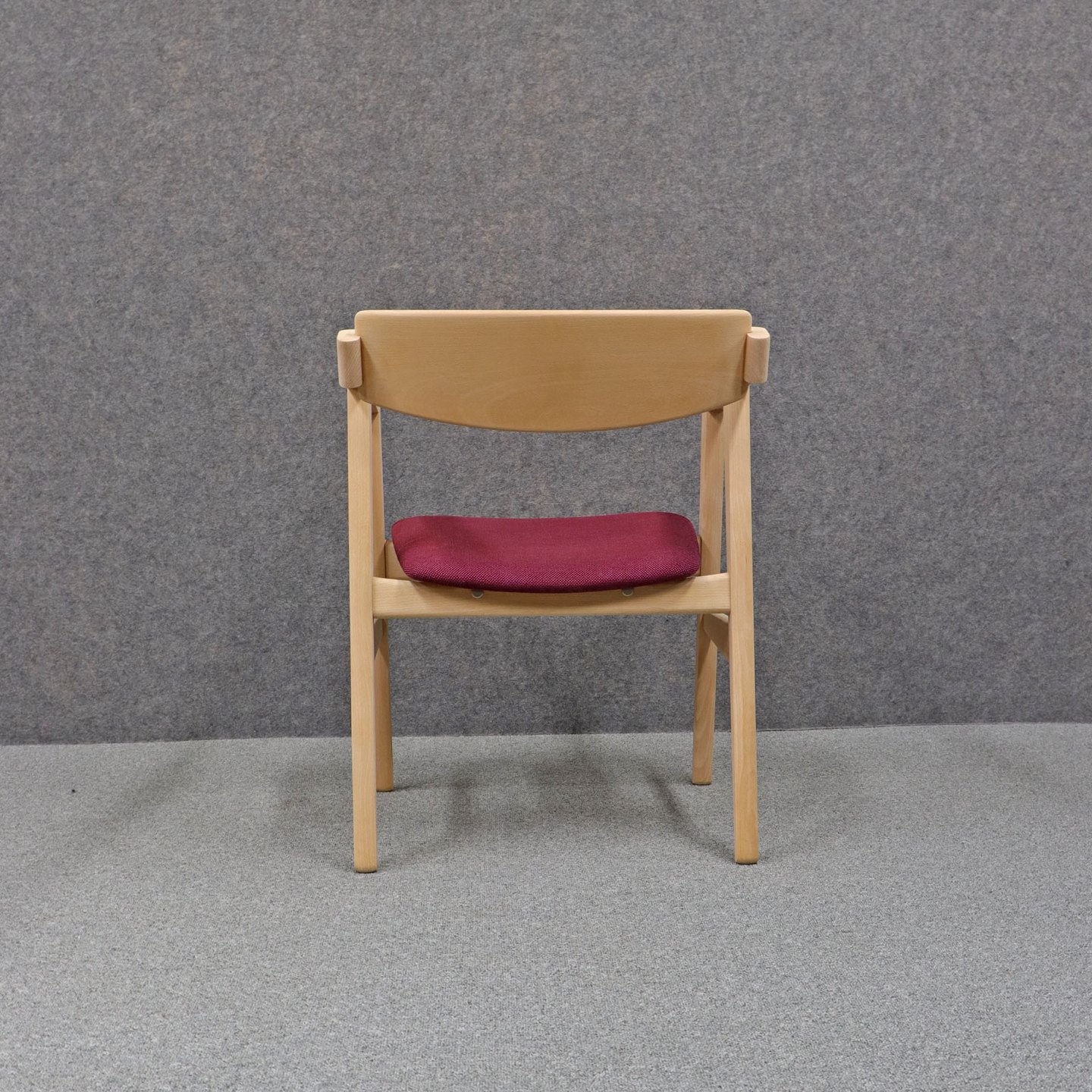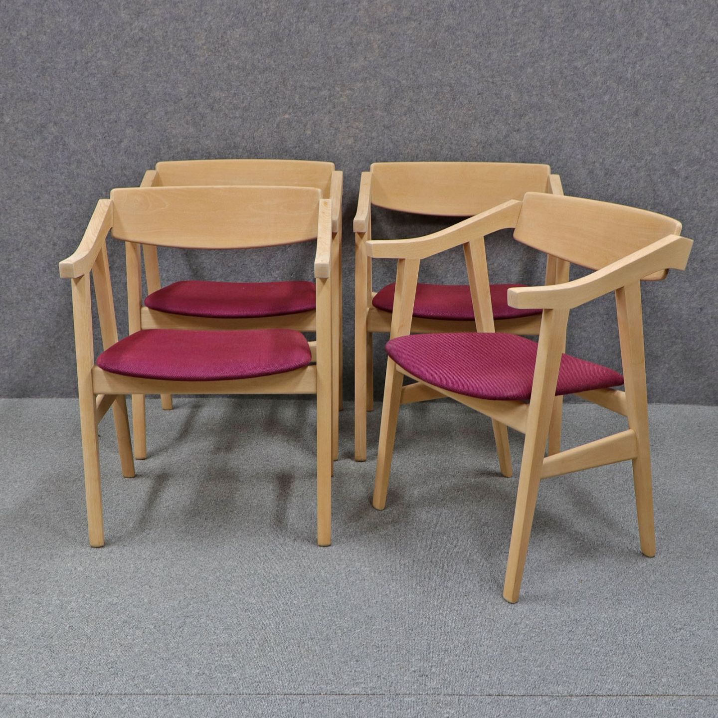 Et sæt spisebordsstole i ubehandlet bøg med polstret sæde betrukket med bourdeaux /lilla stof