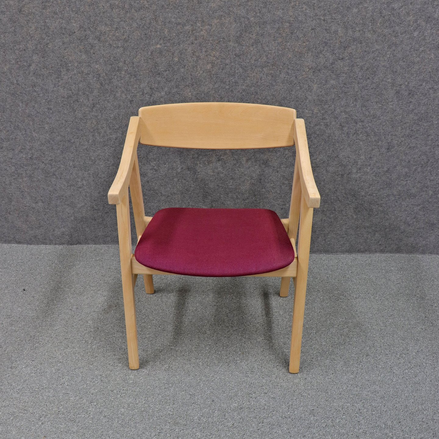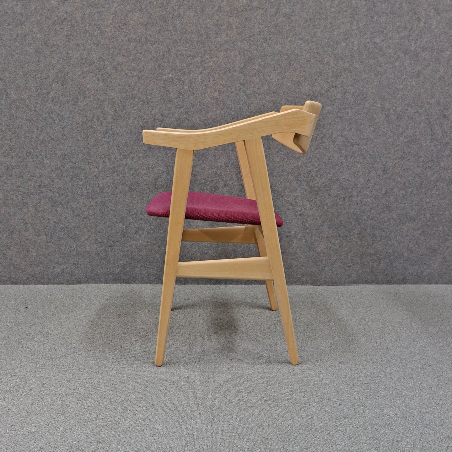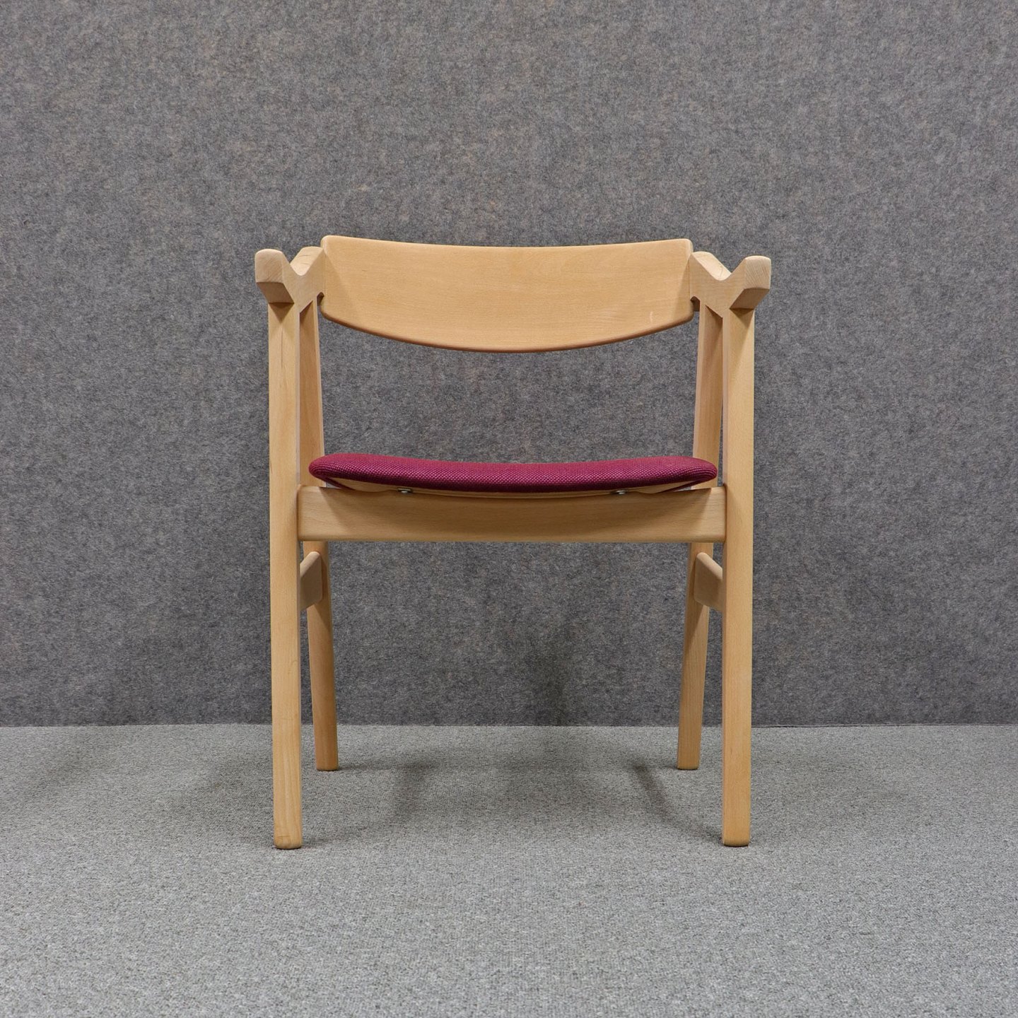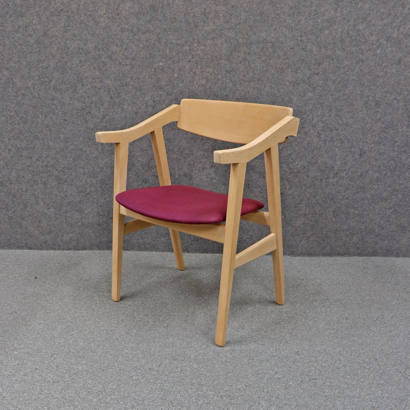 Et sæt spisebordsstole i ubehandlet bøg med polstret sæde betrukket med bourdeaux /lilla stof