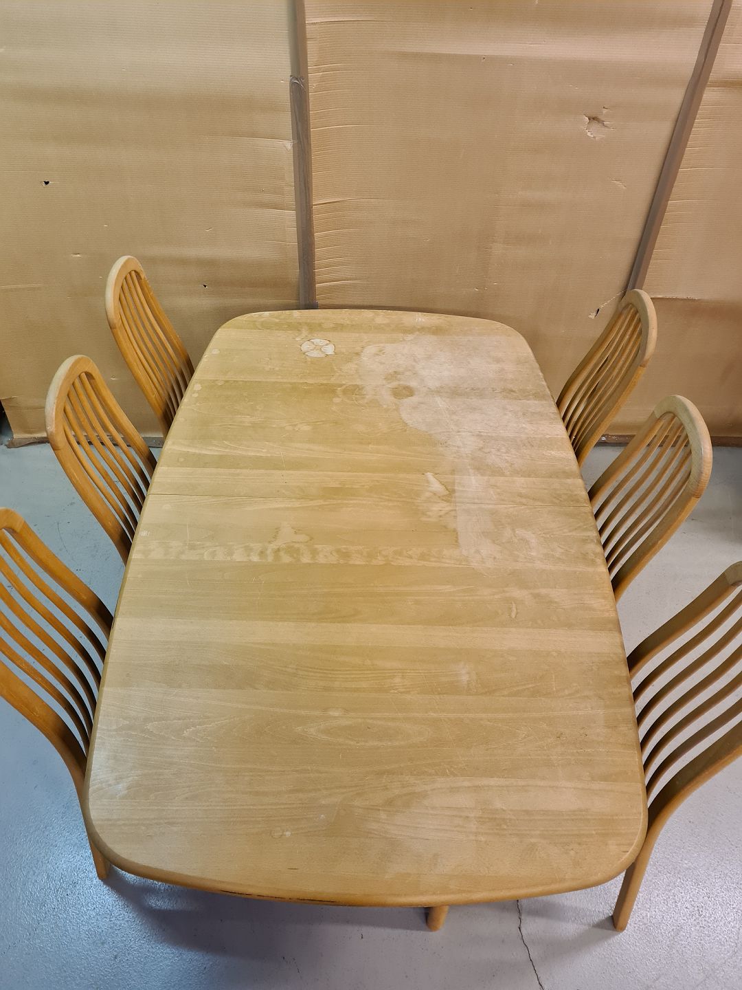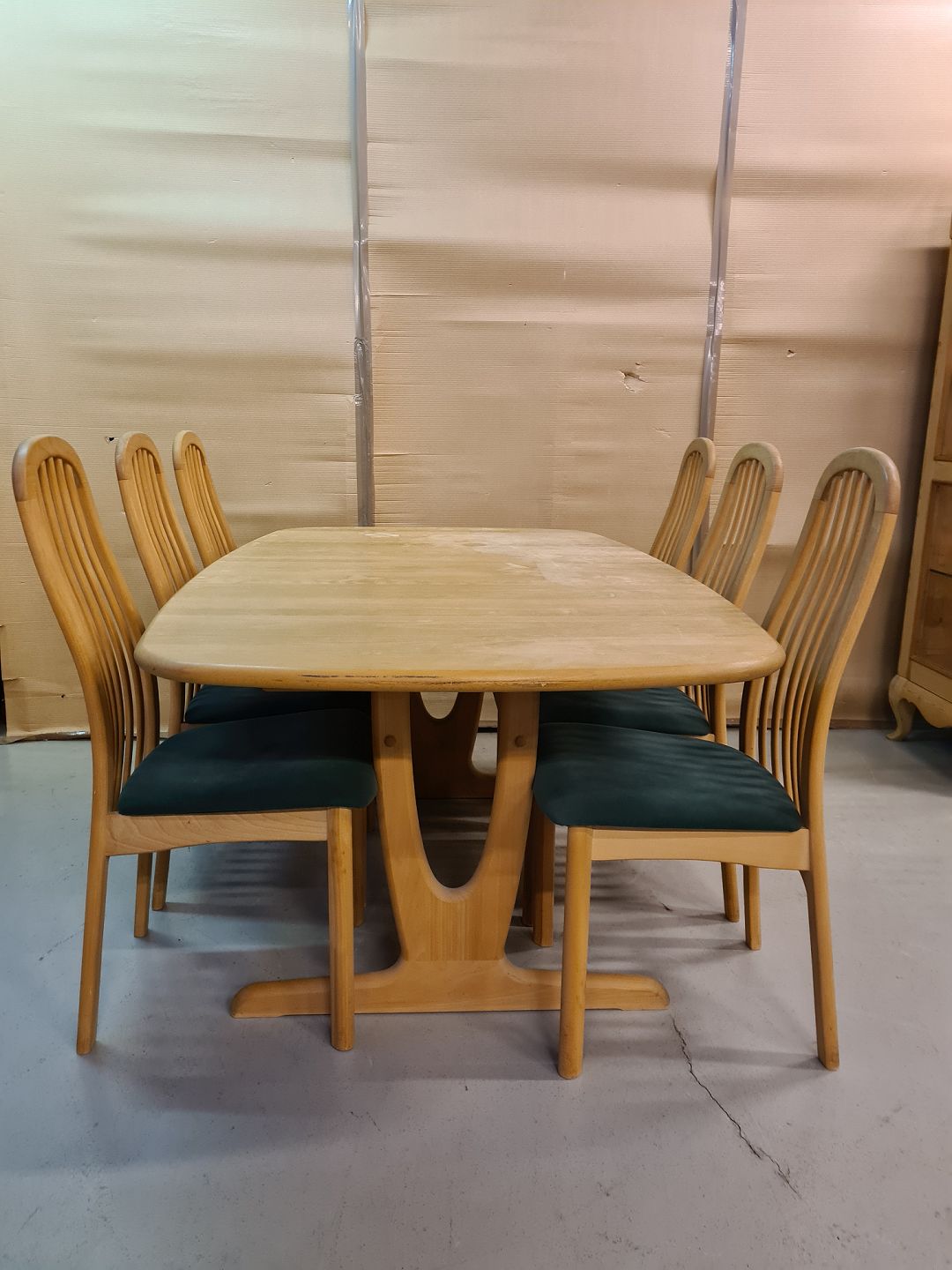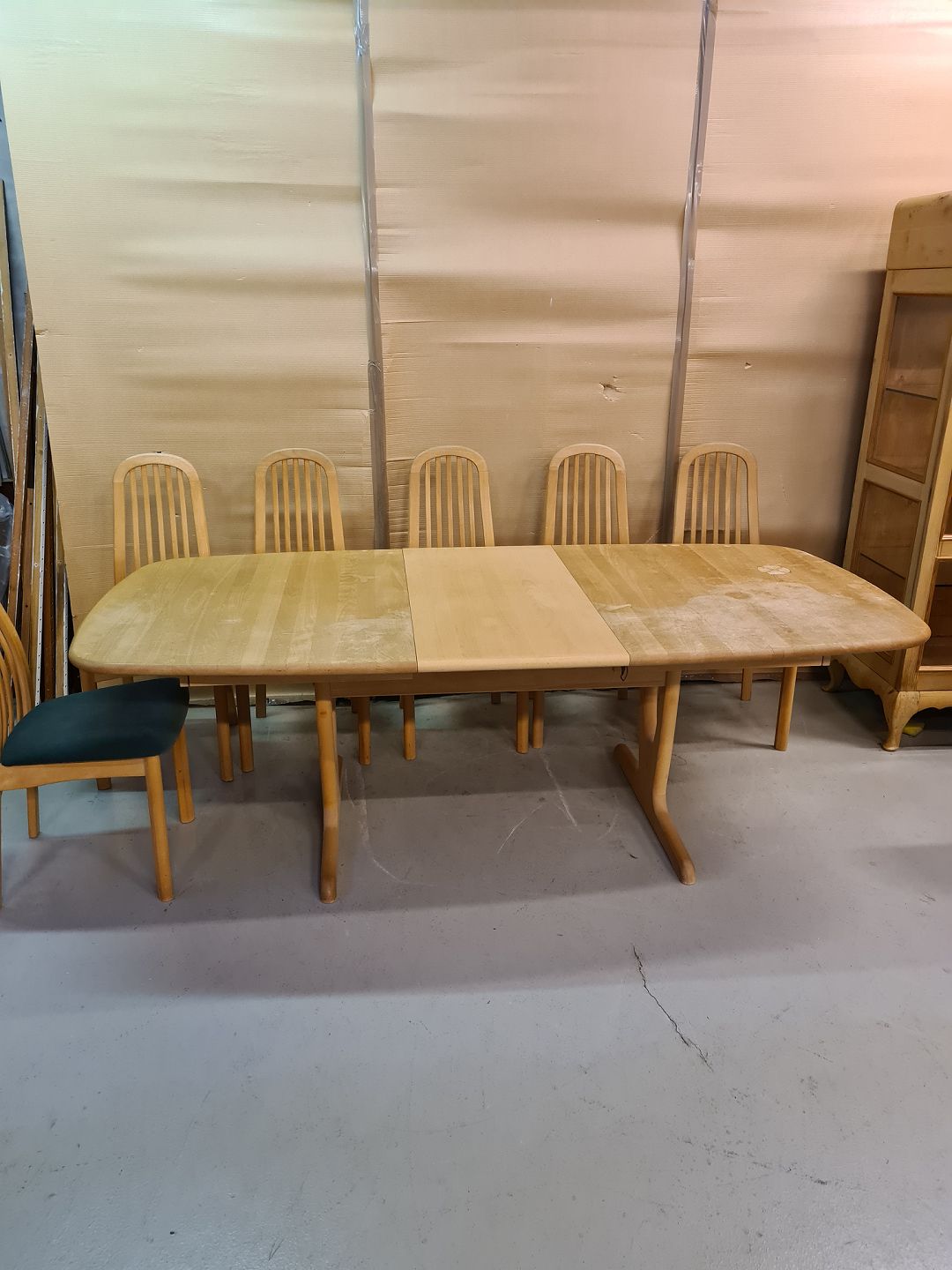 Text available in Danish: Spisebord med 1 tillægsplade og 6 stole i massivt bøgetræ, fra 2000erne.