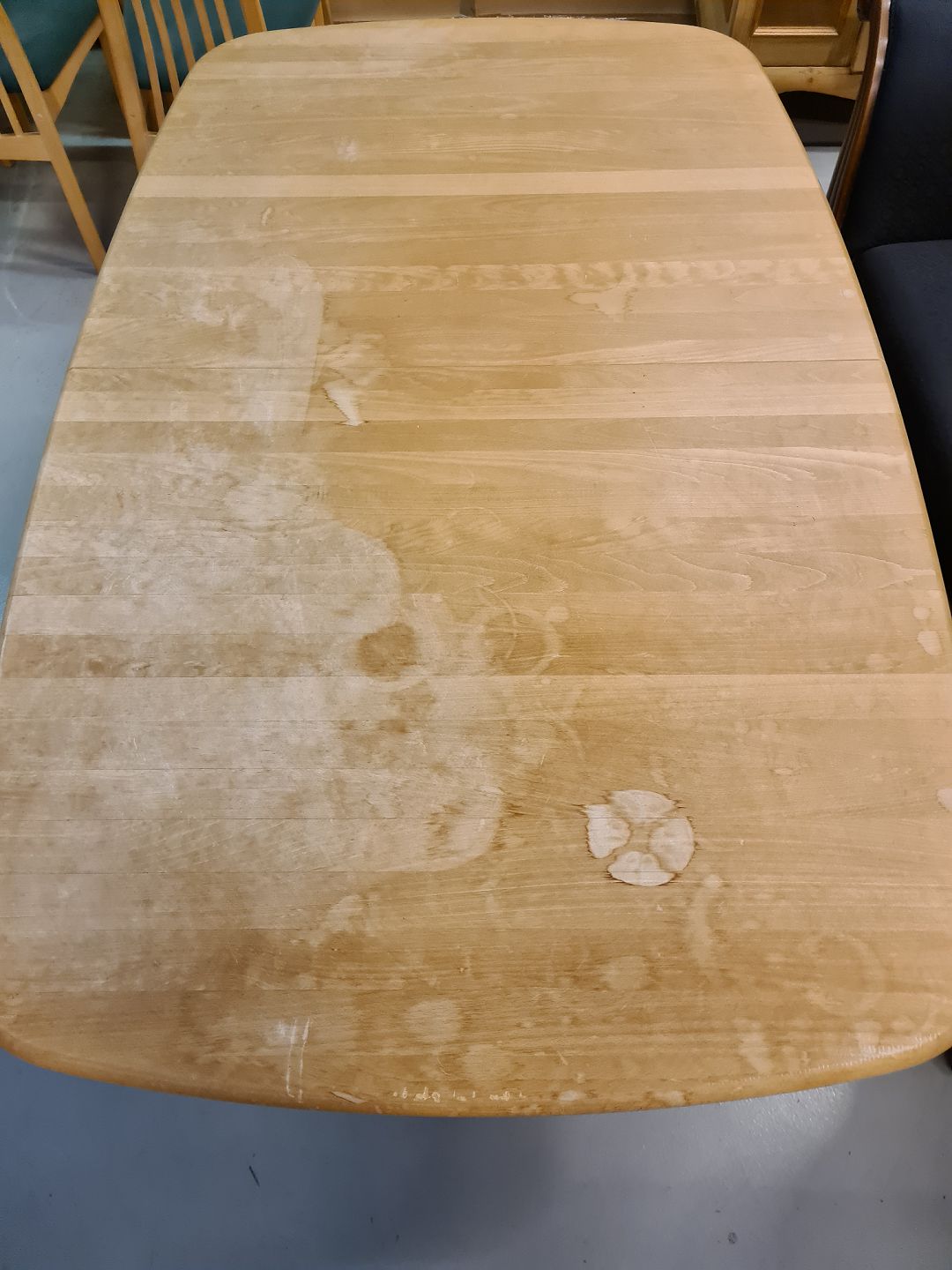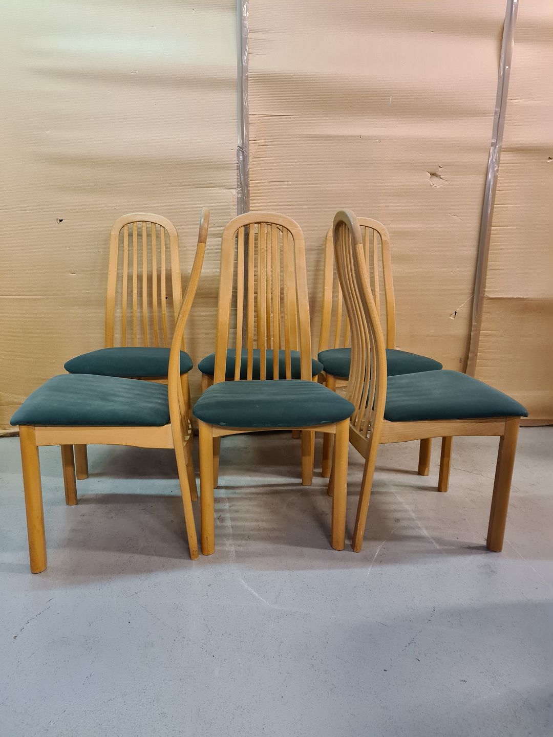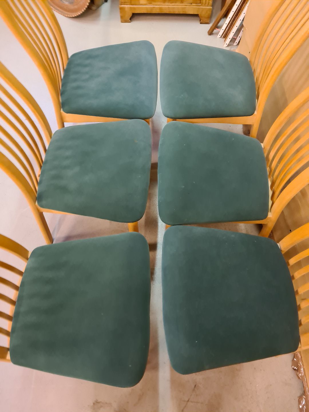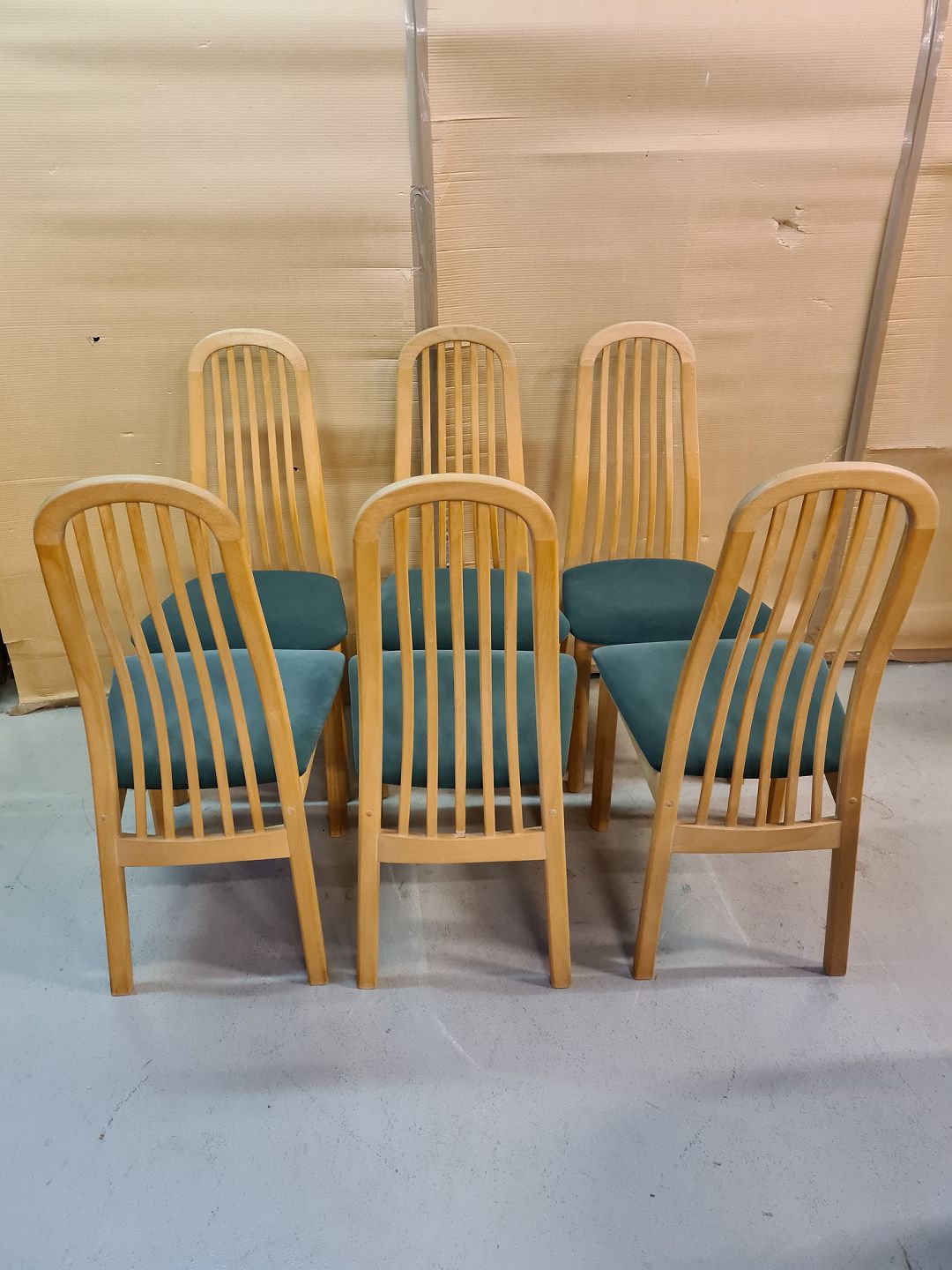 Text available in Danish: Spisebord med 1 tillægsplade og 6 stole i massivt bøgetræ, fra 2000erne.