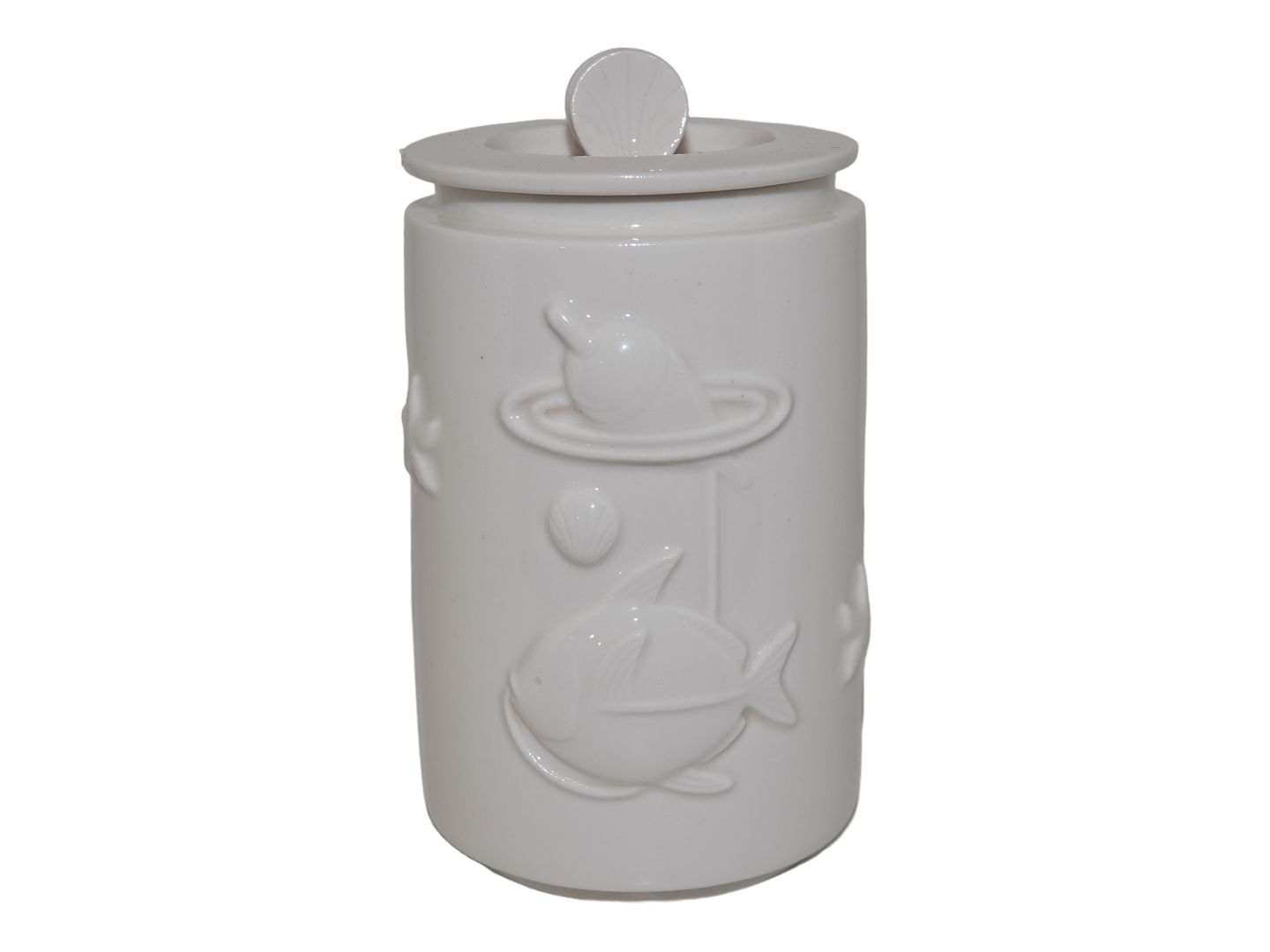 Royal Copenhagen hvid lågkrukke med fisk designet af Arno Malinowski.